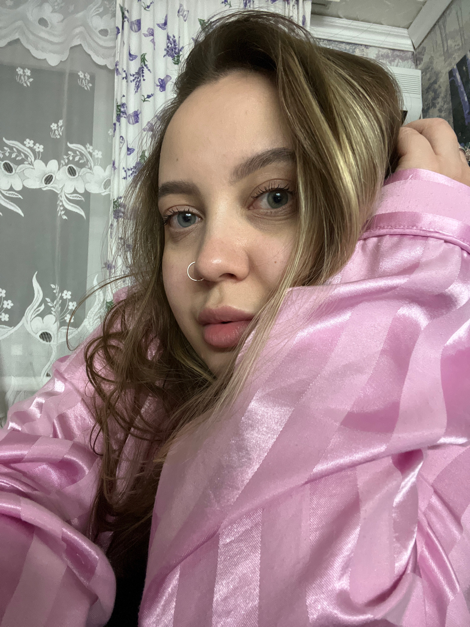 A woman with blonde hair and a nose ring is lying down, wearing a pink striped shirt. She is indoors with floral patterned bedding and curtains. The location in Novopokrovskaya, Russia is not discerni…read more
