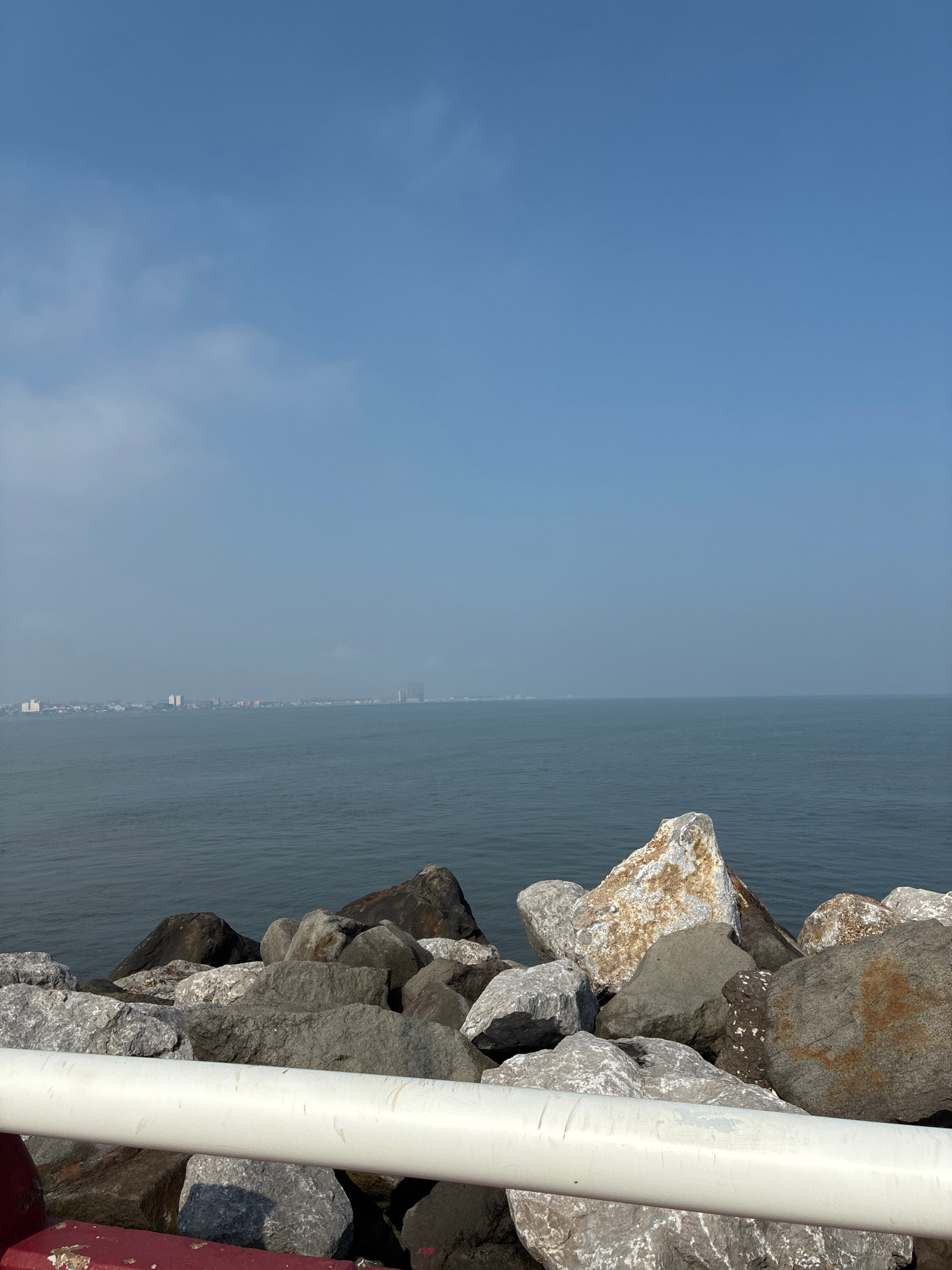 The image shows a coastal scene, likely taken in Coatzacoalcos, Mexico, judging by the visible skyline. The sky is a clear, pale blue with a slight haze. The sea stretches out towards the horizon, itsβ¦read more
