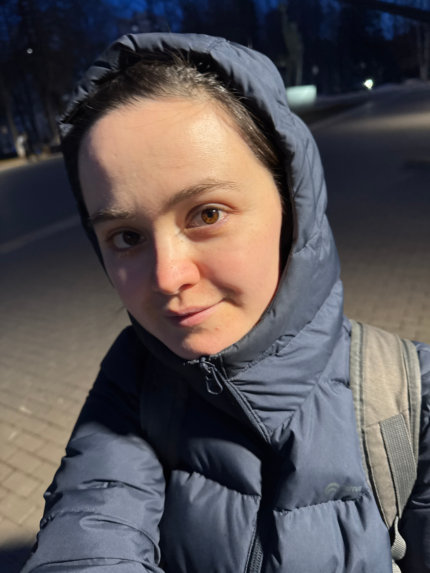 A close-up, tilted selfie shows a woman wearing a dark blue hooded puffer jacket. The hood is up, framing her face. She has light skin, brown eyes, and dark hair. A gray backpack strap is visible over…read more