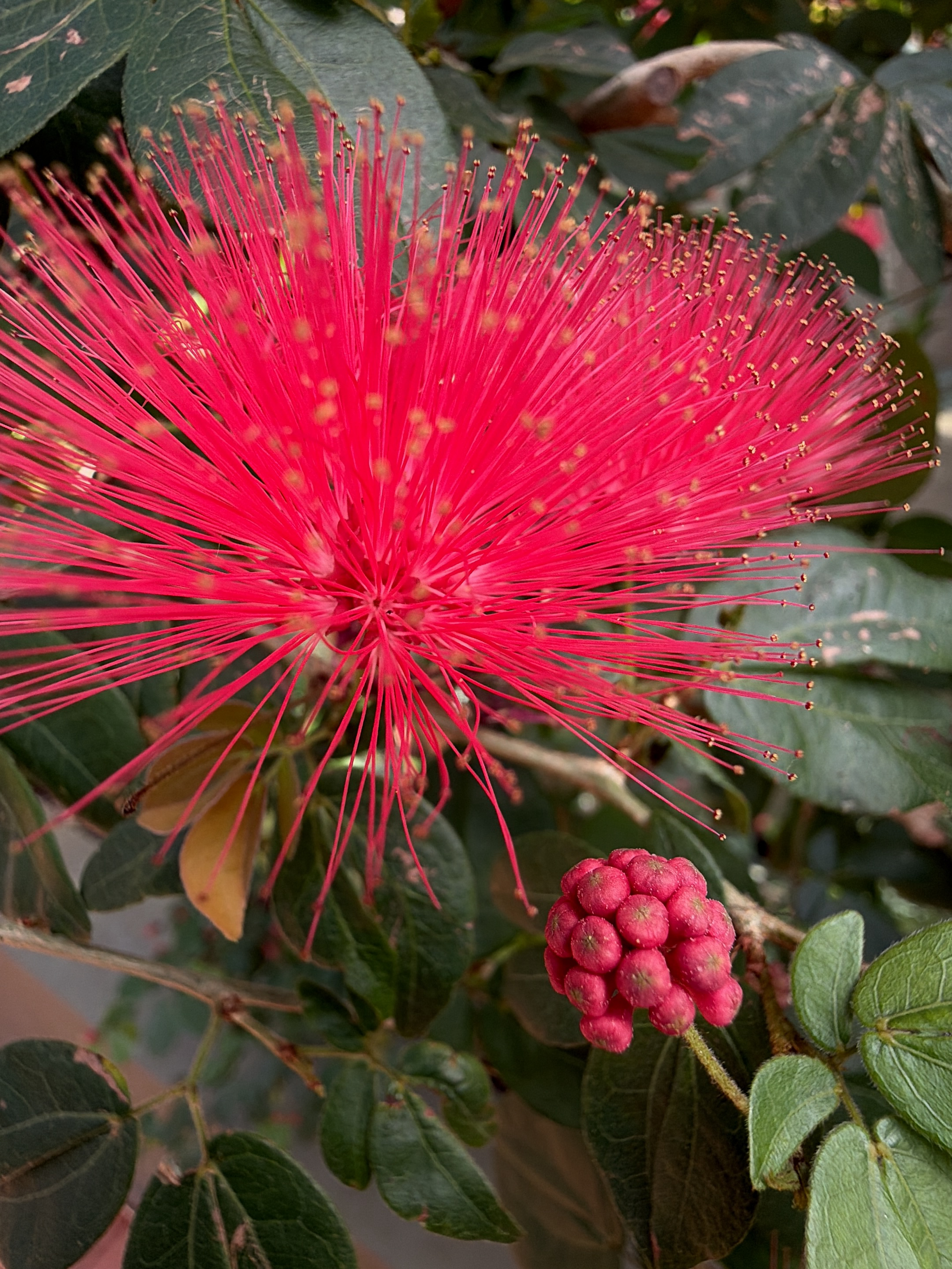 The image shows a red powder puff flower with long, thin stamens surrounded by green leaves. A cluster of smaller, similar-colored buds is also visible below the flower. The exact location is unclear,โฆread more
