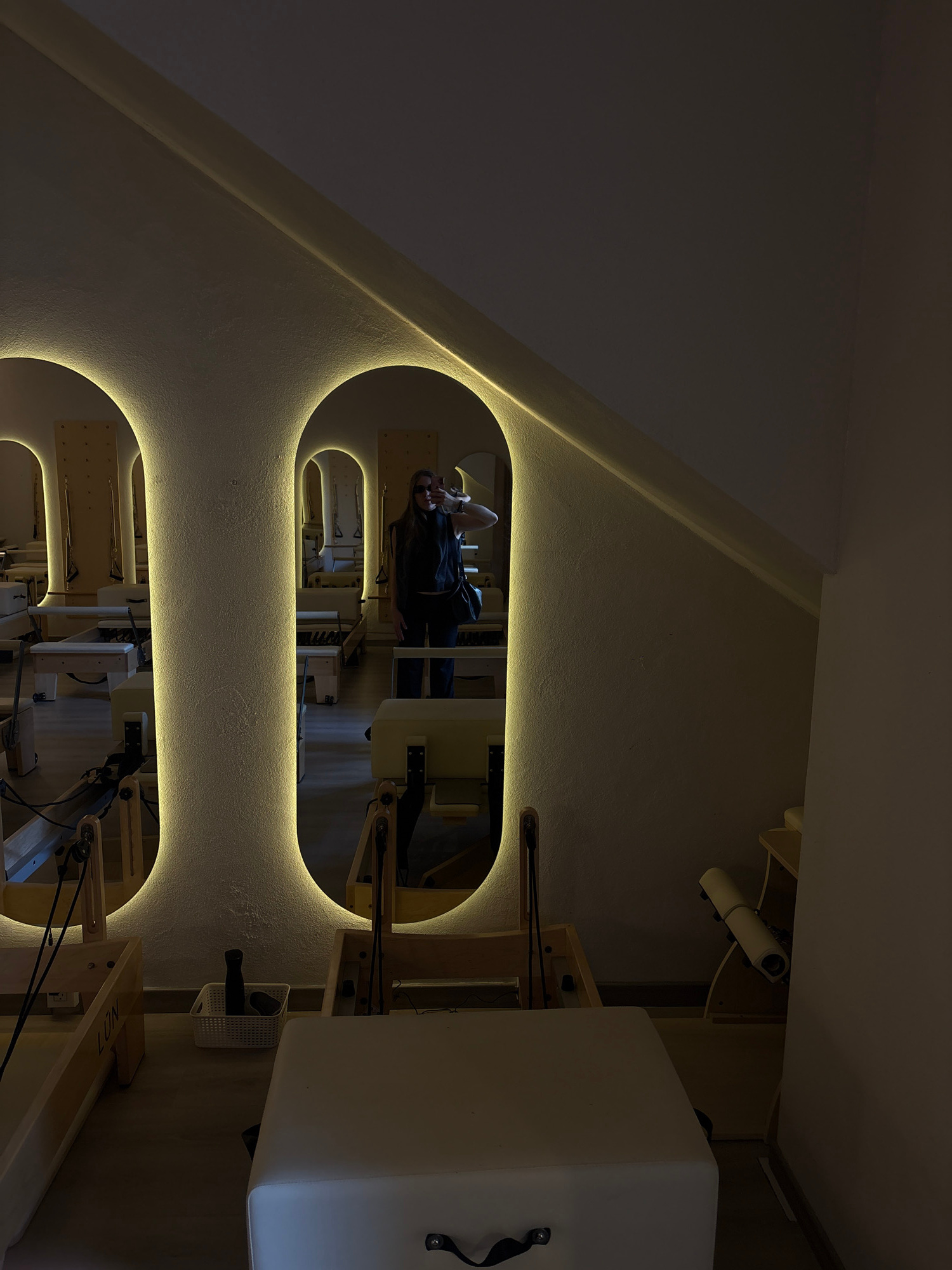 The image shows the interior of a pilates studio, likely in Mexico City, Mexico, based on the presence of a person reflected in a rounded wall-mounted mirror. The mirror is illuminated with warm, glow…read more