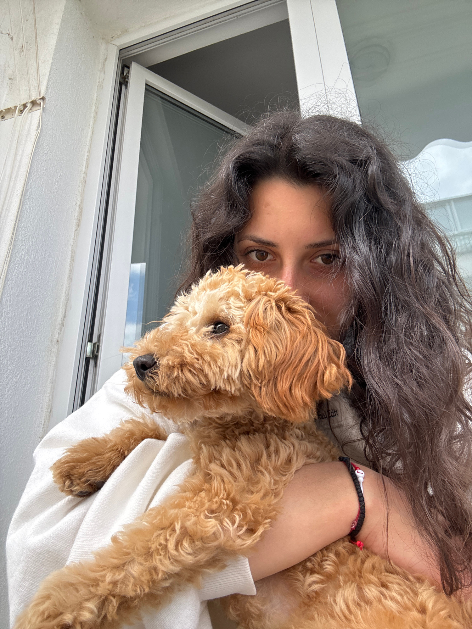 A tilted, medium shot captures a woman holding a small, golden-brown poodle puppy. The woman has long, dark, wavy hair, and her face is partially visible, revealing brown eyes. She is wearing a white…read more