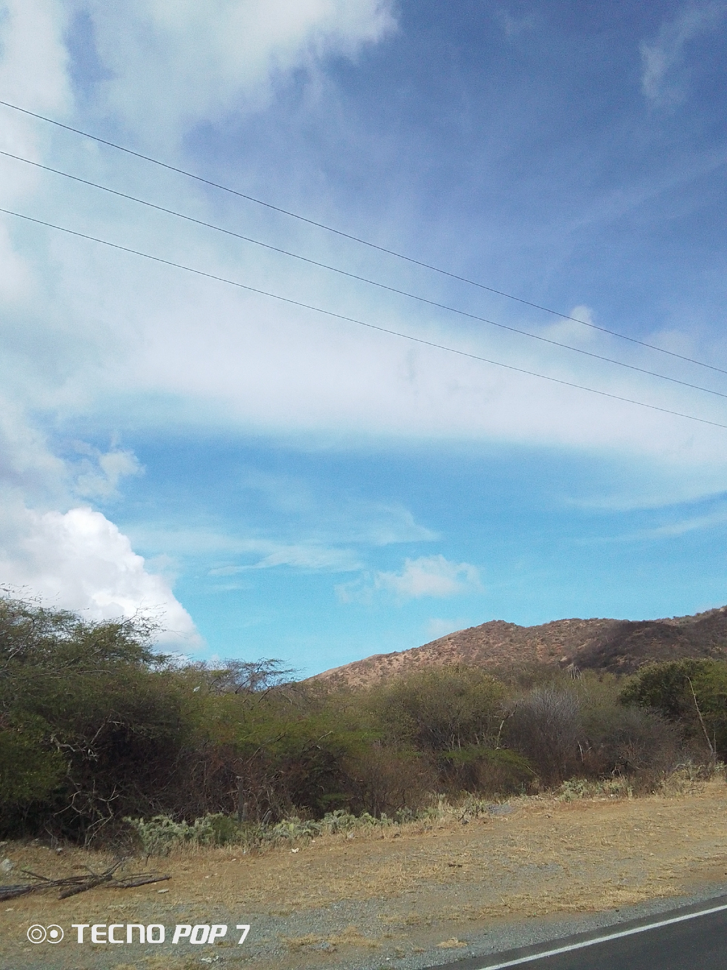 The image shows a landscape scene in Pedro González, Venezuela. In the foreground, there's dry grassy terrain with vegetation consisting of shrubs and trees. In the mid-ground, a low-lying, brown, scr…read more