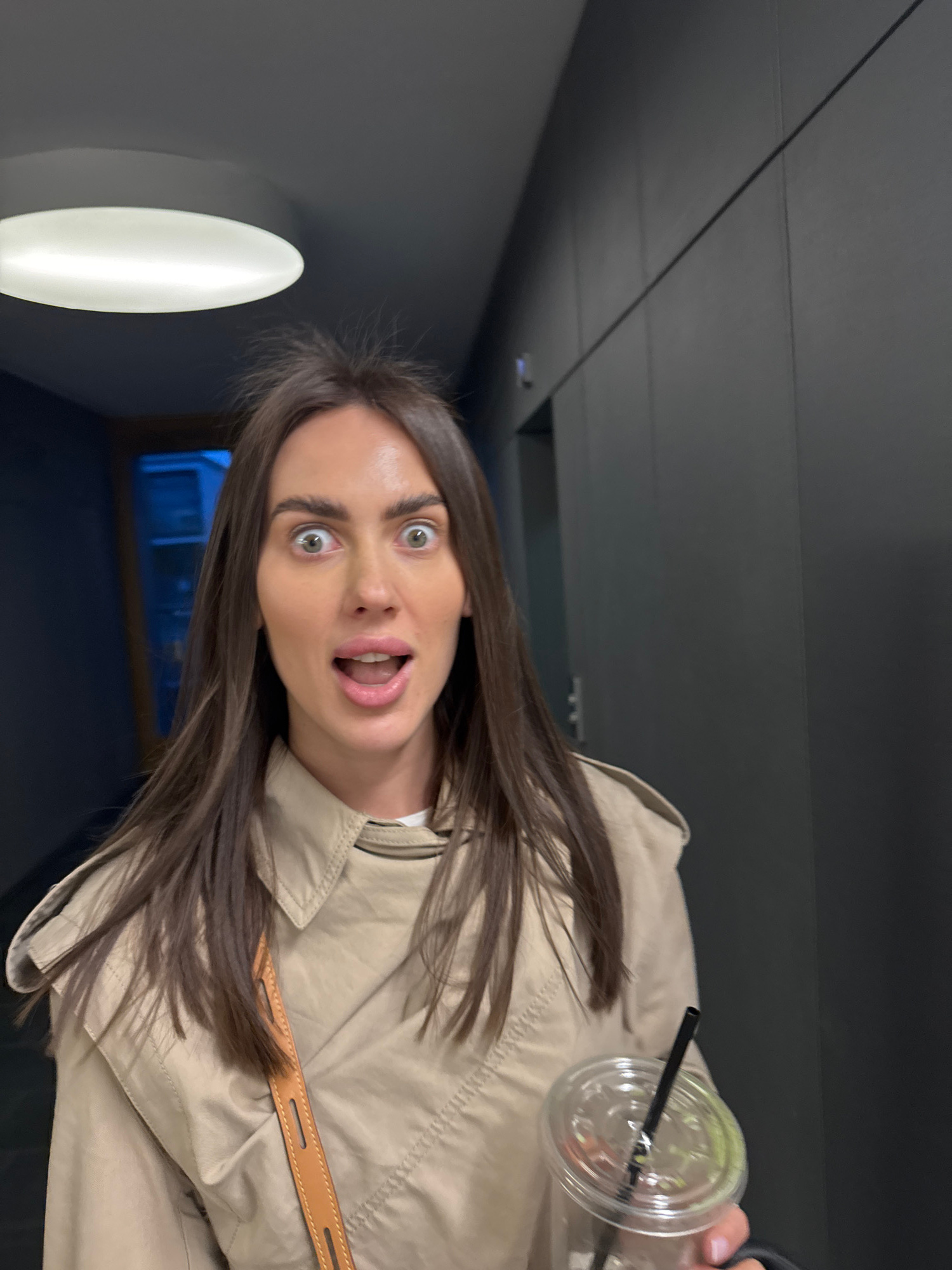A woman is captured in a selfie-style image, holding a plastic cup with a straw, possibly containing a beverage. She is wearing a light beige trench coat. The background suggests an indoor setting, po…read more