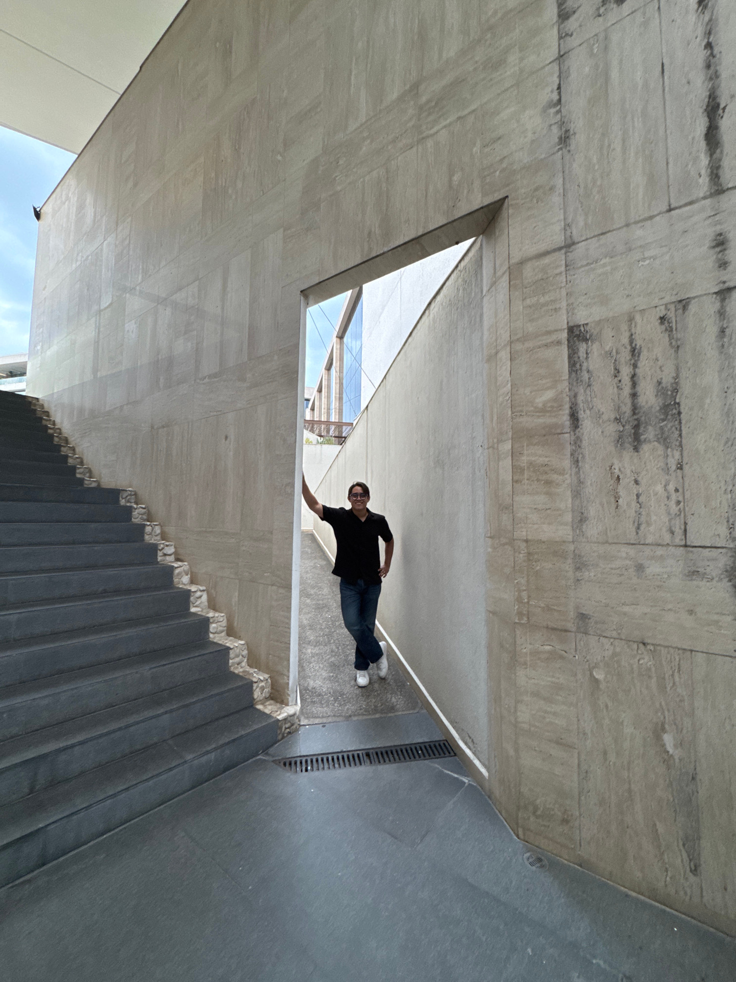 A medium shot shows a man in dark clothes seemingly clinging to the side of a concrete structure in San Andrés Cholula, Mexico. The man is wearing a black shirt, blue jeans, and white shoes. He is pos…read more