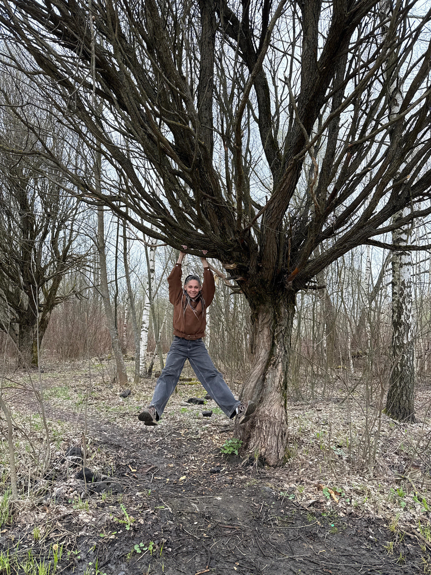 A person is hanging from a large, bare tree in a wooded area. The person is wearing a brown jacket and gray pants, and appears to be holding onto the tree branches with both hands. The ground is coverβ¦read more