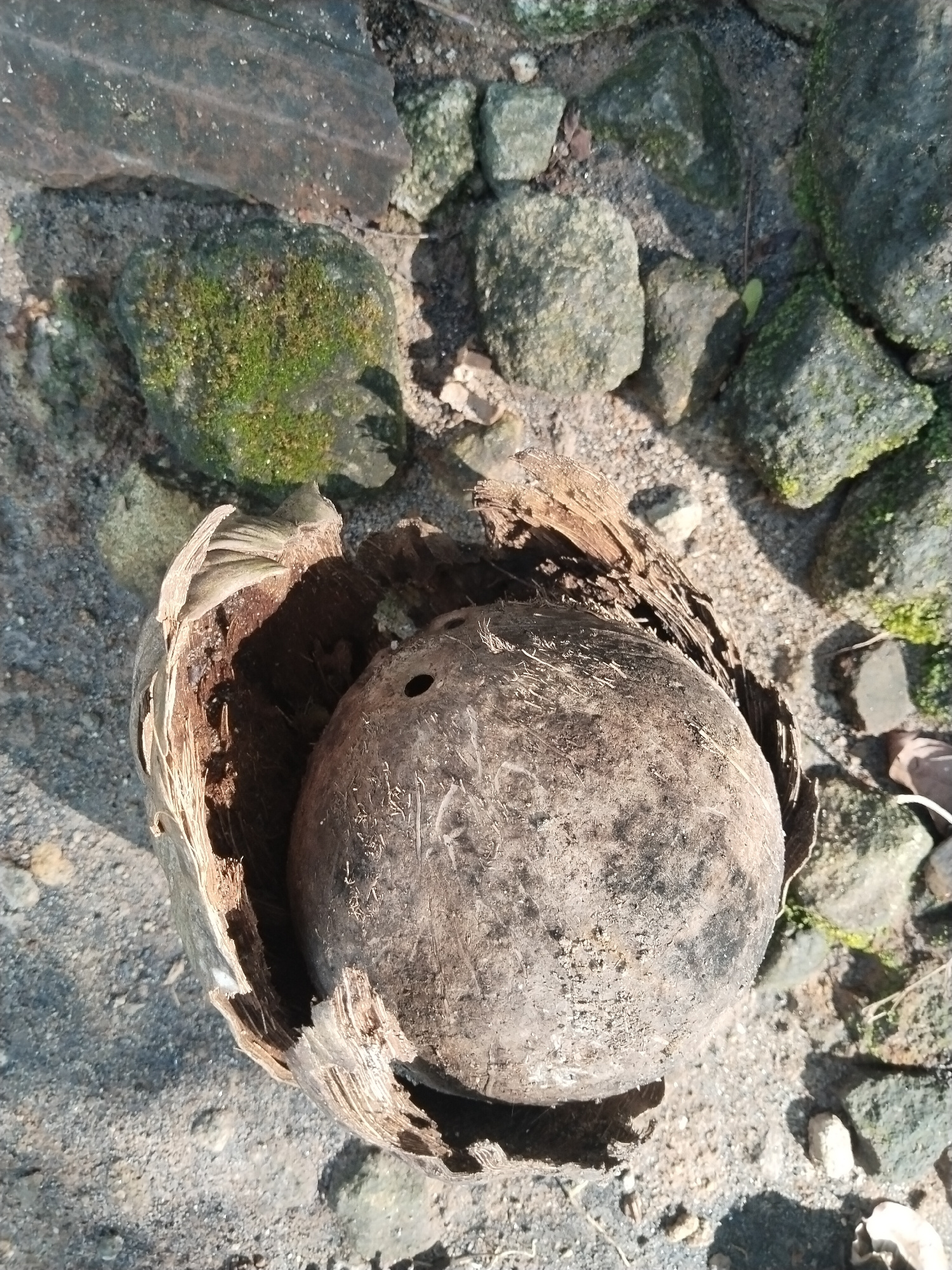 The image depicts a partially broken coconut shell on a ground surface in an undetermined location in the city of Unknown, Unknown. The coconut shell has two distinct holes. The surrounding environmen…read more