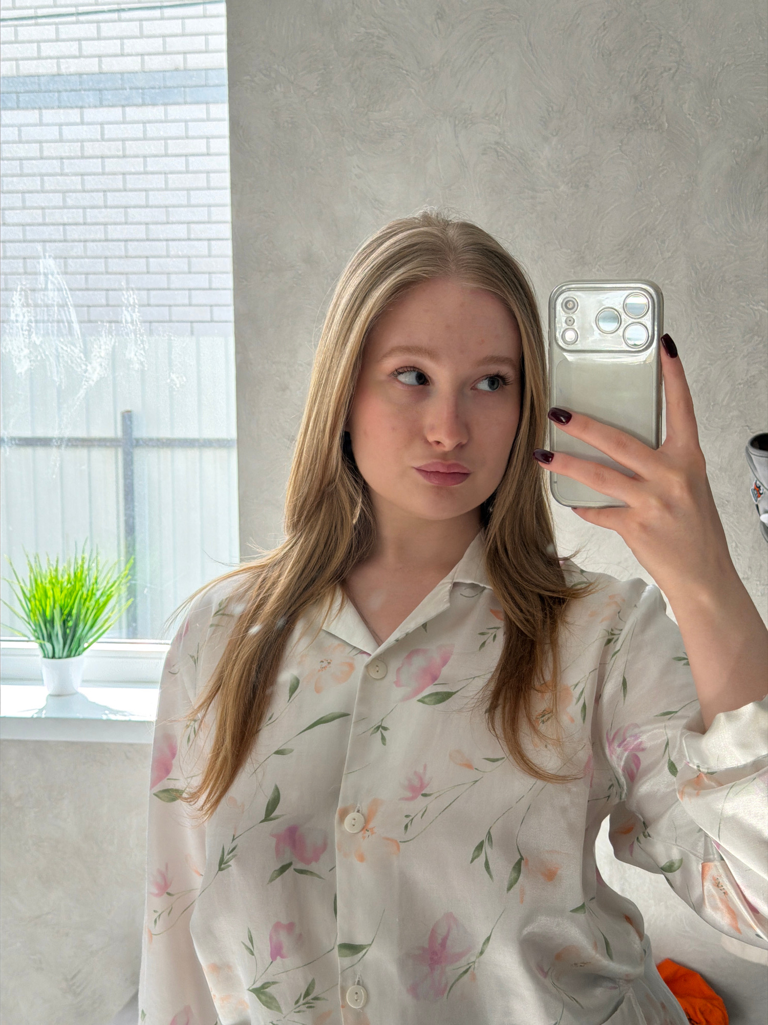 A young woman is taking a selfie. She is wearing a floral print pajama top and holding a silver smartphone with her right hand. Her nails are painted in a dark, possibly maroon color. She has long, bl…read more
