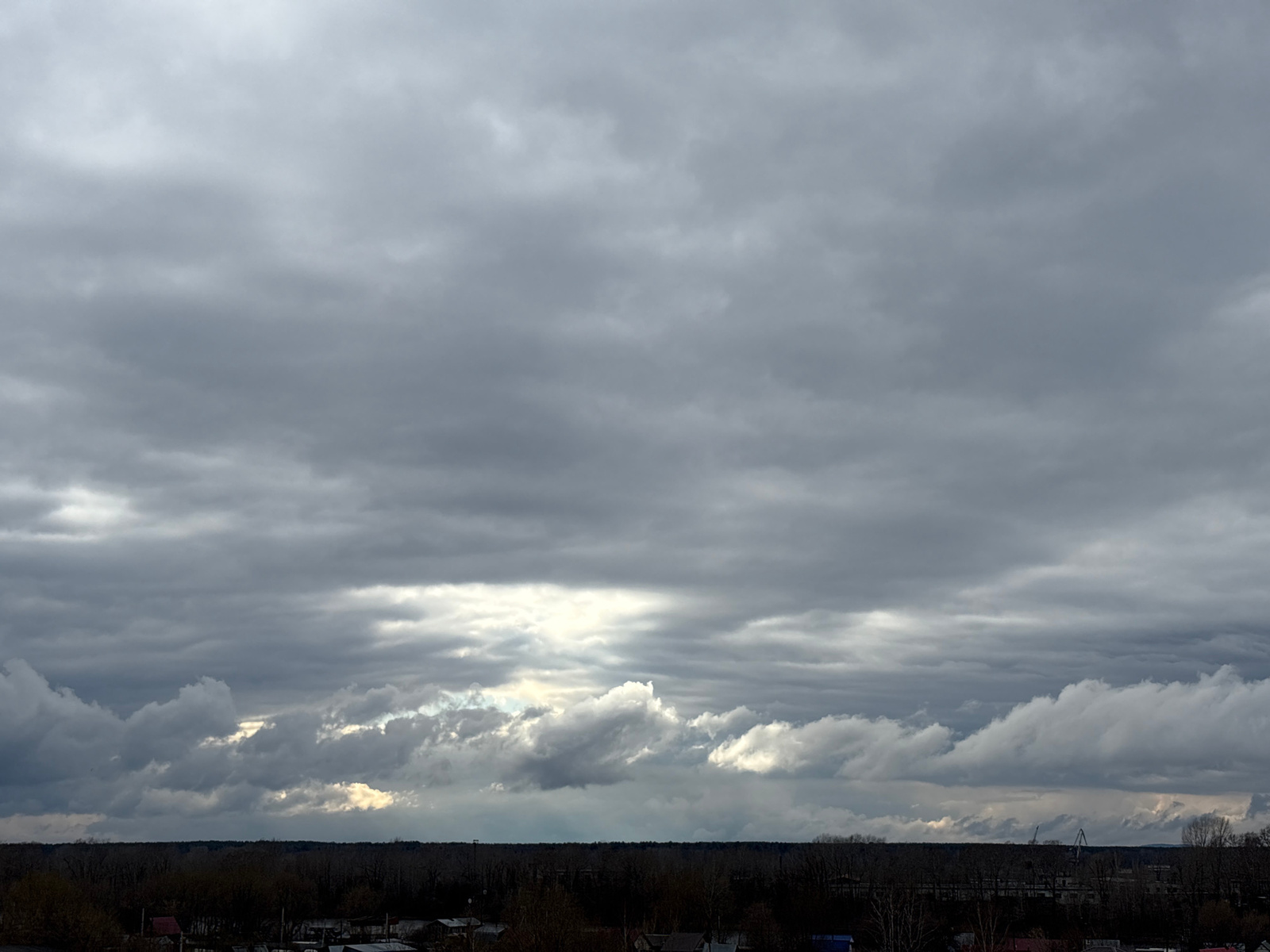 The image presents a wide-angle landscape dominated by a vast, overcast sky, stretching above a distant horizon line. The sky is filled with multiple layers of grey clouds, varying in shade from darke…read more