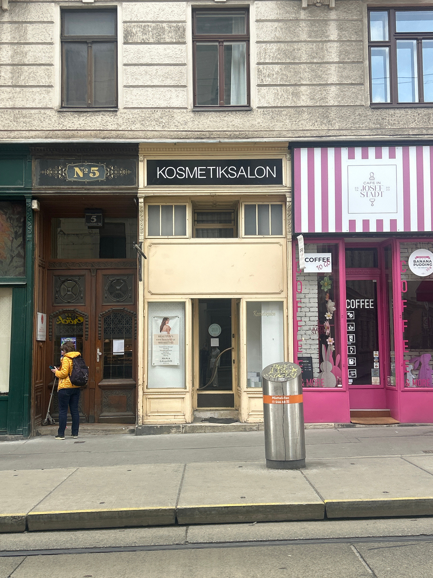 Here is a detailed description of the image: The image depicts a street scene in Vienna, Austria, showcasing a row of storefronts. The facades of the buildings are distinct, with varying architectura…read more