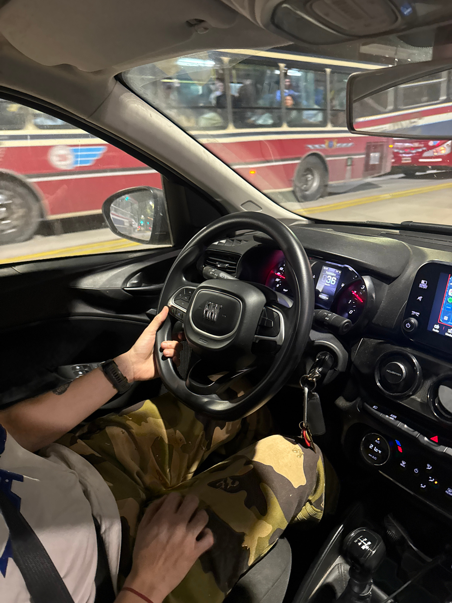 The image depicts the interior of a car with the driver visible in the lower right portion of the frame. The driver is wearing a white t-shirt, camo pants, and a smartwatch. The car's dashboard, steer…read more