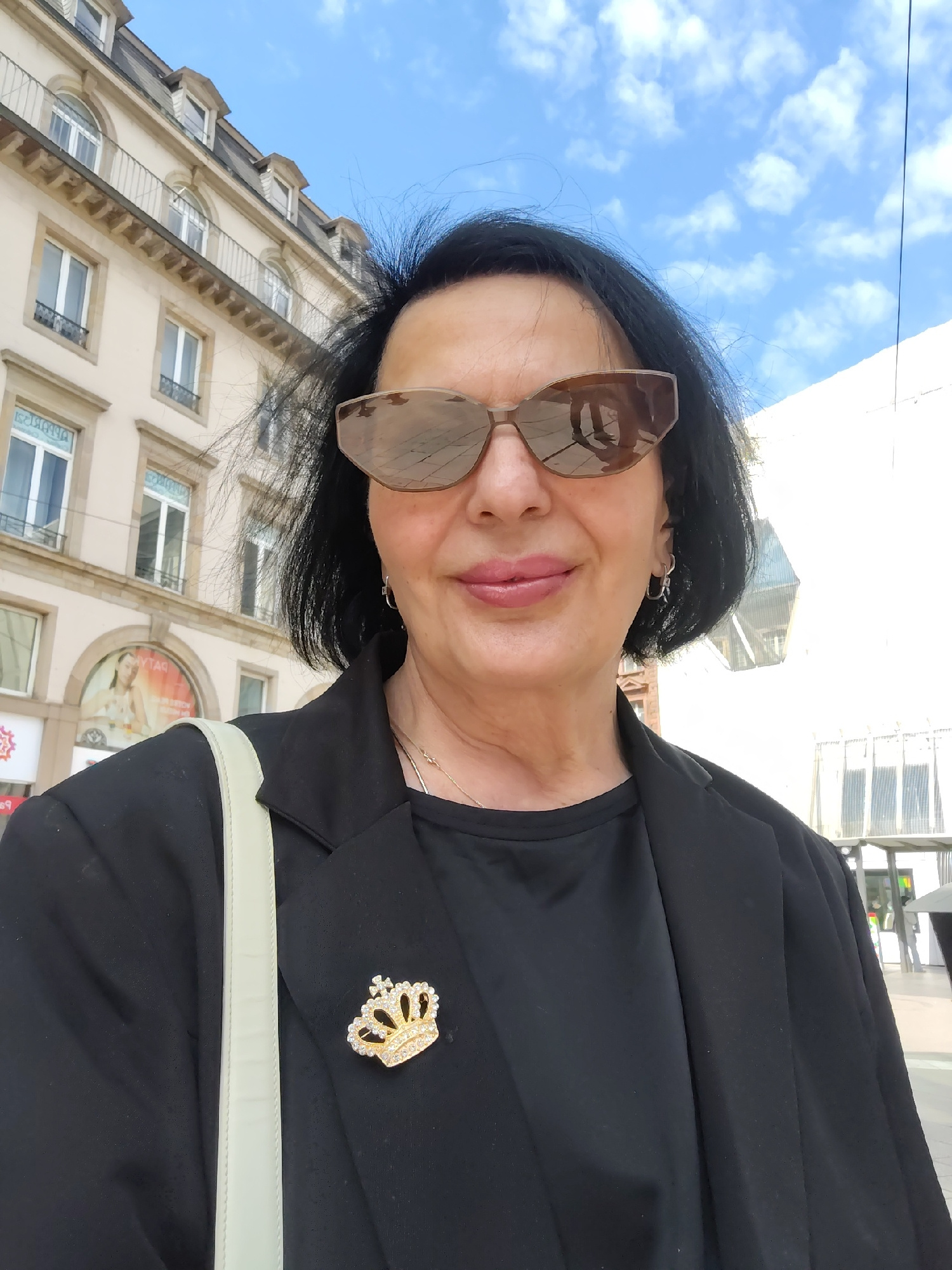A woman wearing sunglasses, a black blazer with a crown-shaped brooch, and a light-colored shoulder bag stands on a city street. The building in the background has a row of arched windows and a sign w…read more
