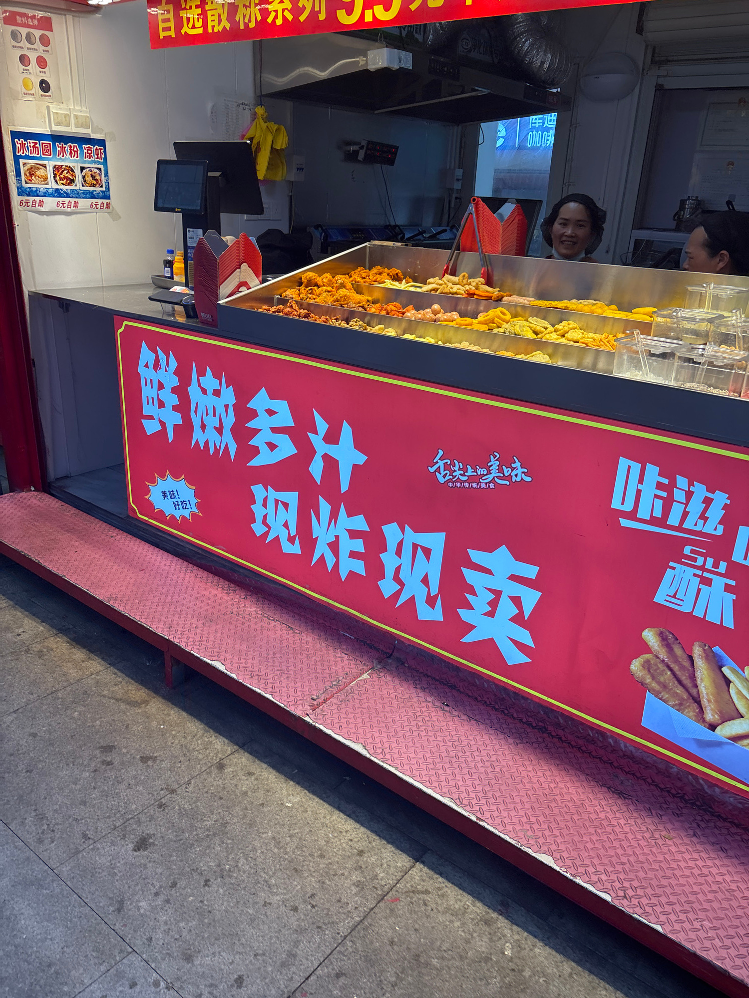 The image shows an outdoor food stall in Yongchuan, China, featuring a red sign in Chinese with white text, offering deep-fried food. A person is behind the stall looking into the camera, there is foo…read more