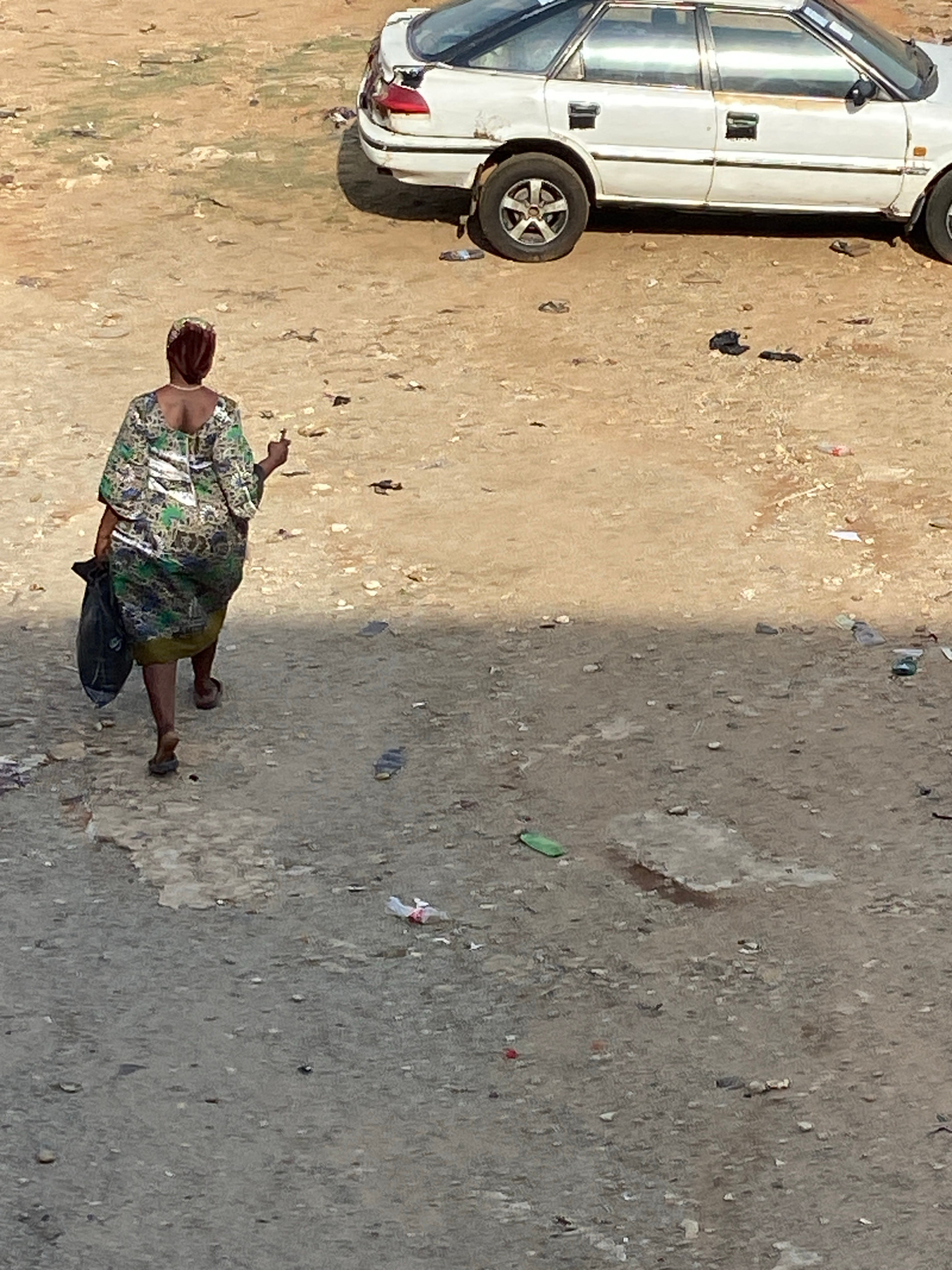The image depicts an outdoor scene, likely a street or open ground, under bright daylight conditions, suggested by the strong shadows and clear light. The ground is uneven, a mix of dry, sandy earth o…read more