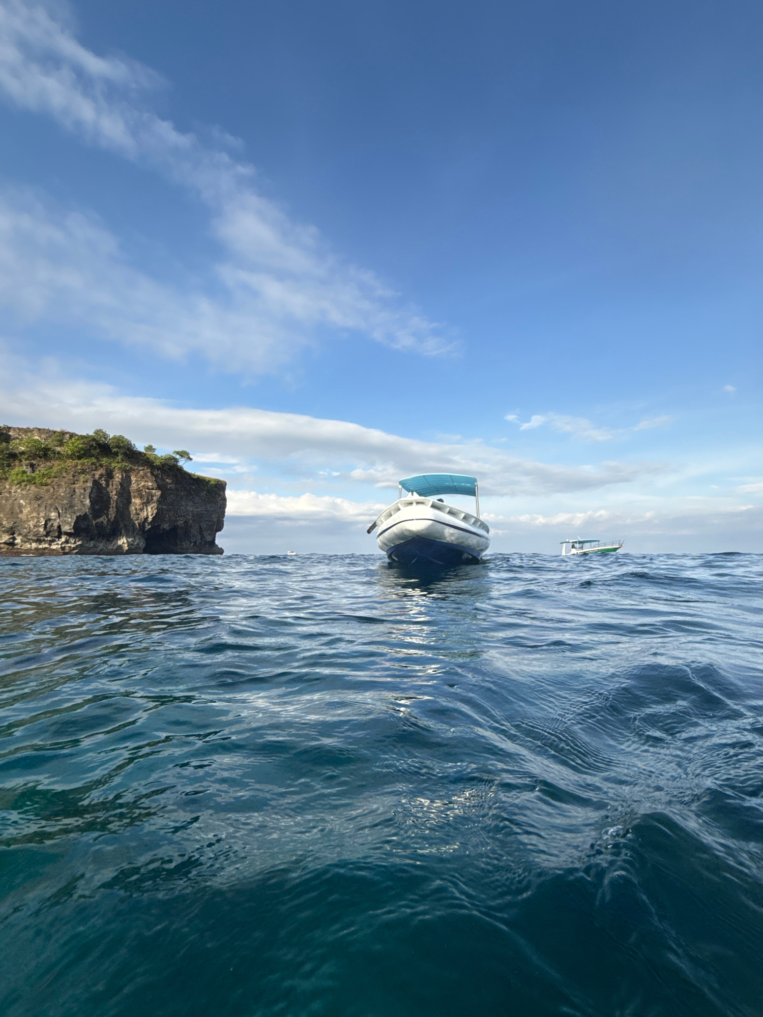 This image captures a tranquil tropical marine landscape, likely off the coast of Nusa Penida, Indonesia. The scene is viewed from water level, looking across the ocean towards a dramatic coastline an…read more