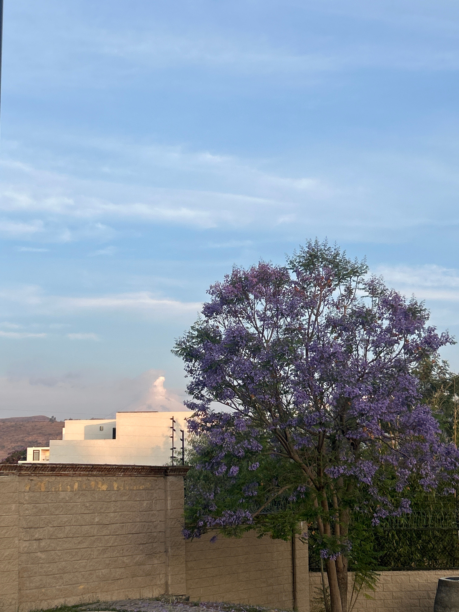 The image shows a view of a street in Santa Clara Ocoyucan, Mexico, featuring a Jacaranda tree in full bloom with purple flowers. The tree stands next to a concrete wall, beyond which there is a white…read more