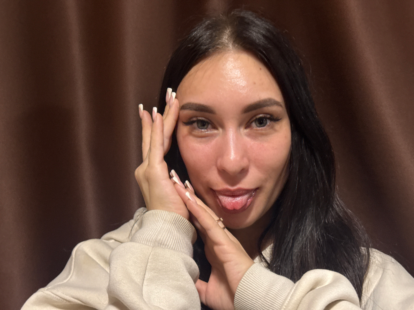 A young adult woman is centered in the frame with a brown draped background. She has fair skin, dark hair, and her tongue is slightly protruding from her mouth. Her hands are held up near her face, wi…read more