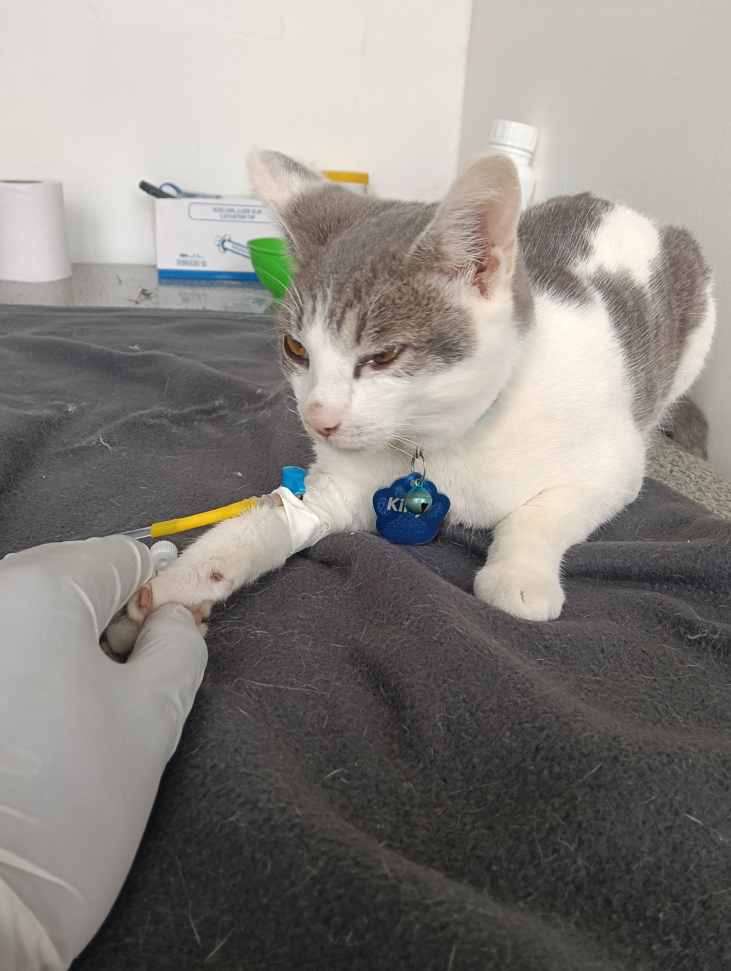 A grey and white cat is sitting on a dark grey blanket on a table. A gloved hand is holding the cat's front paw, which has a catheter inserted. The cat is wearing a blue collar with a blue flower-shap…read more