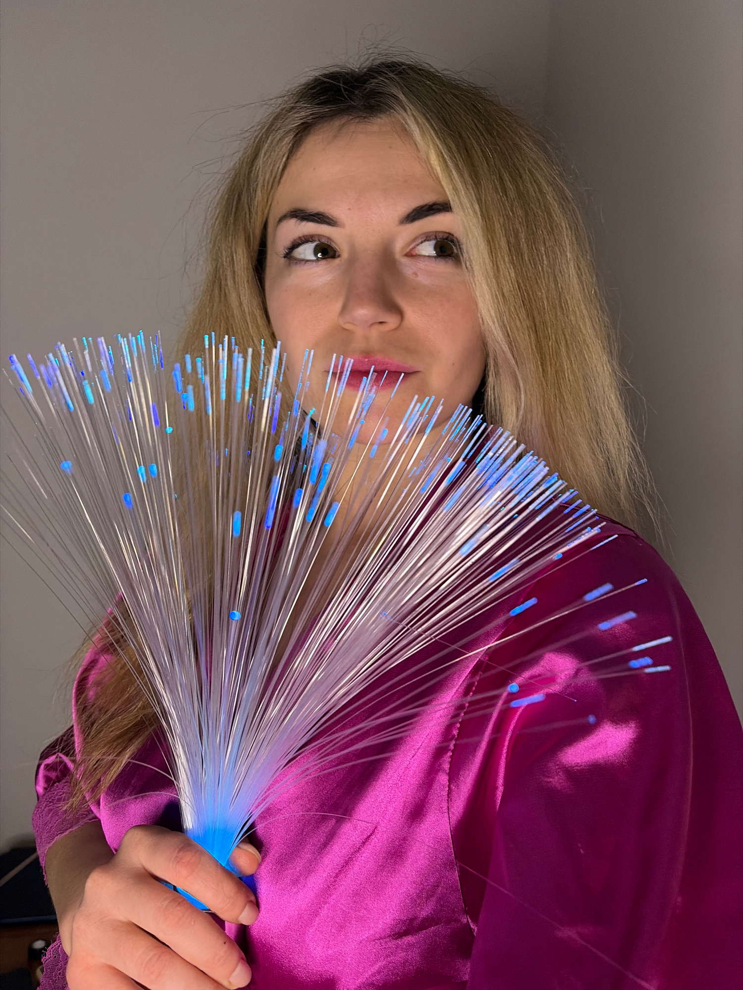 A fair-skinned woman with blond hair is holding a fiber optic light in front of her face. The light is emitting blue light from the tips of the fibers. She is wearing a pink, satin-like garment. The b…read more
