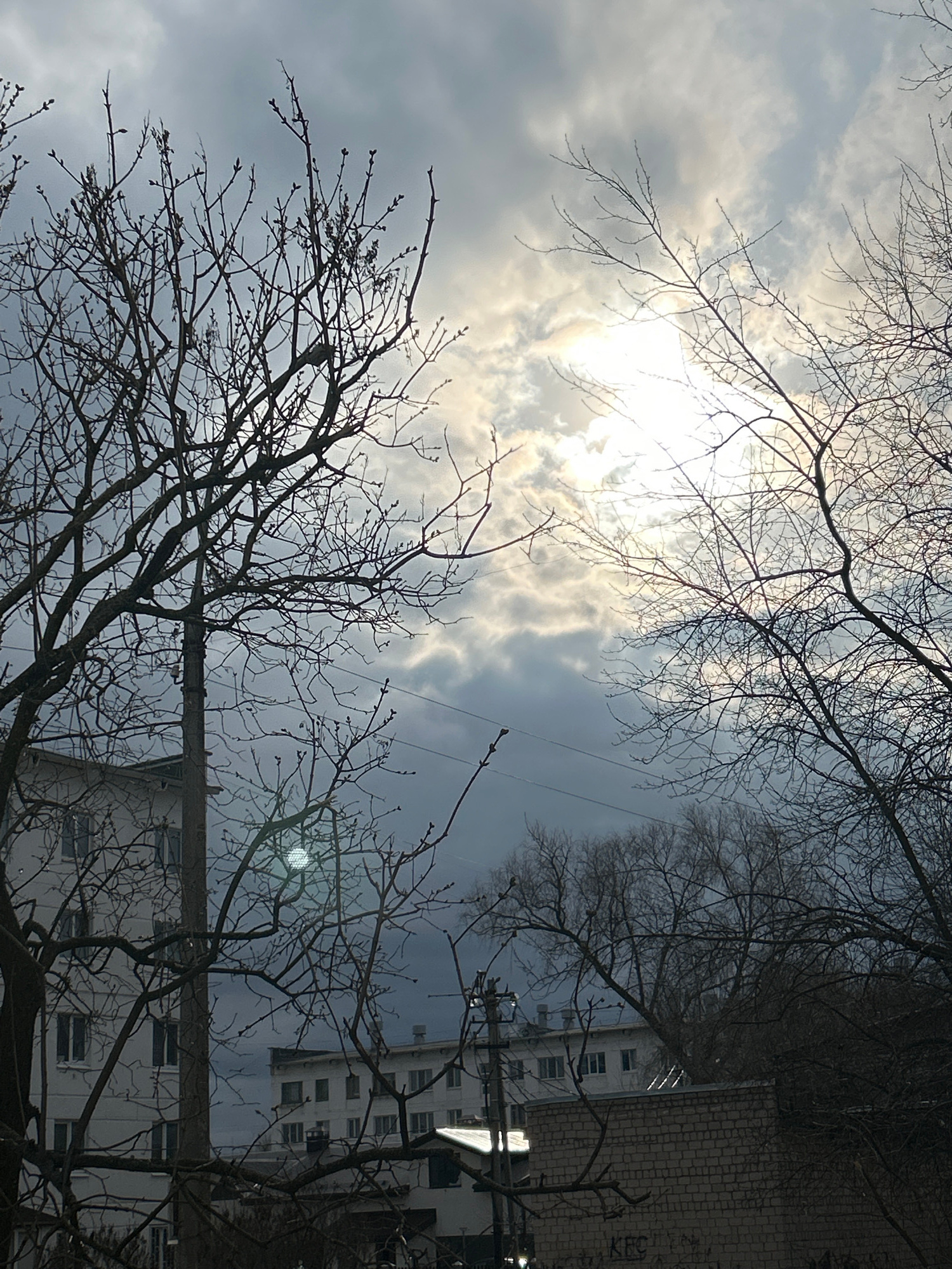 The image depicts a low-angle view of bare tree branches against a cloudy sky with the sun obscured by clouds. Buildings are visible in the background on the right side. A utility pole and wires are a…read more
