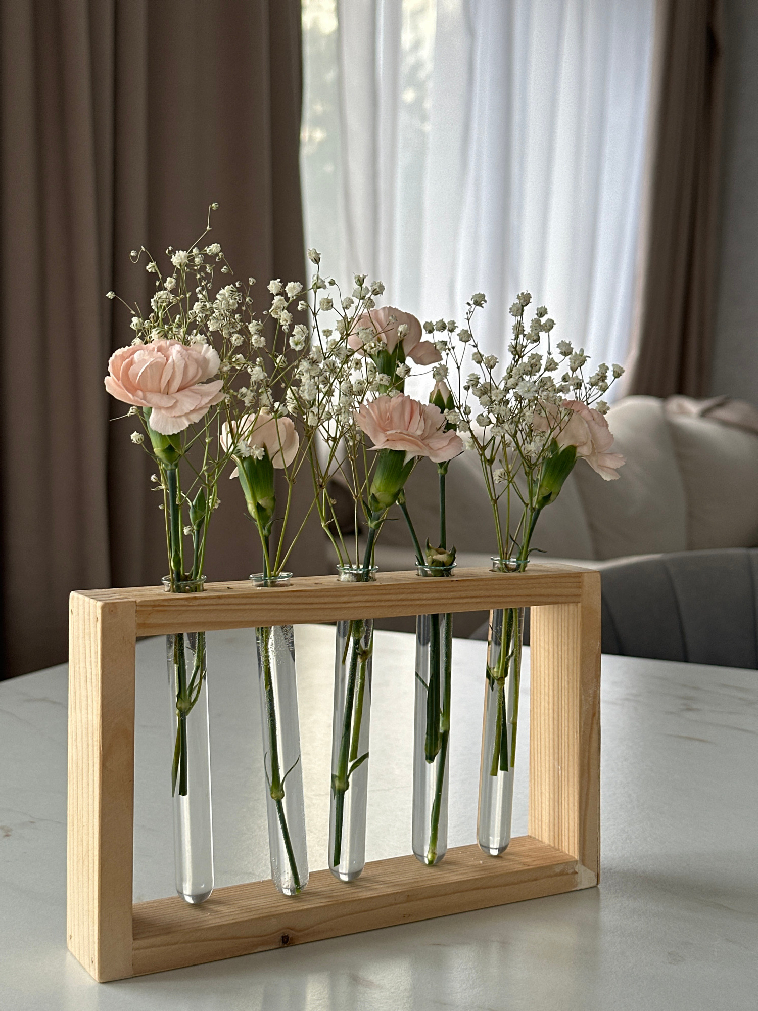 The image shows a wooden frame holding five glass test tubes filled with water and flowers. The flowers are a mix of pink carnations and baby's breath. The frame is sitting on a white surface, possibl…read more