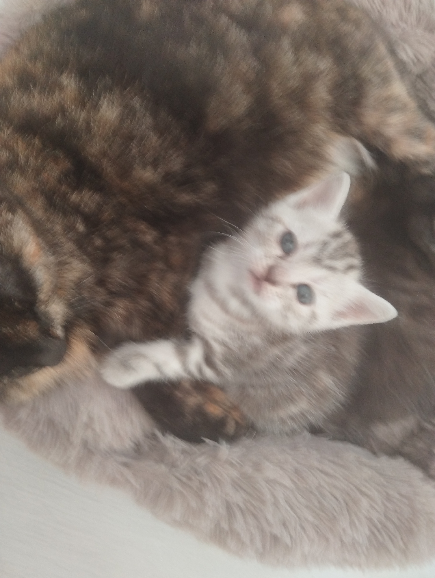 A small, light gray tabby kitten with blue eyes is lying on a larger, brown tabby cat. The background is a soft, furry material. The location and city are not discernible from the image.