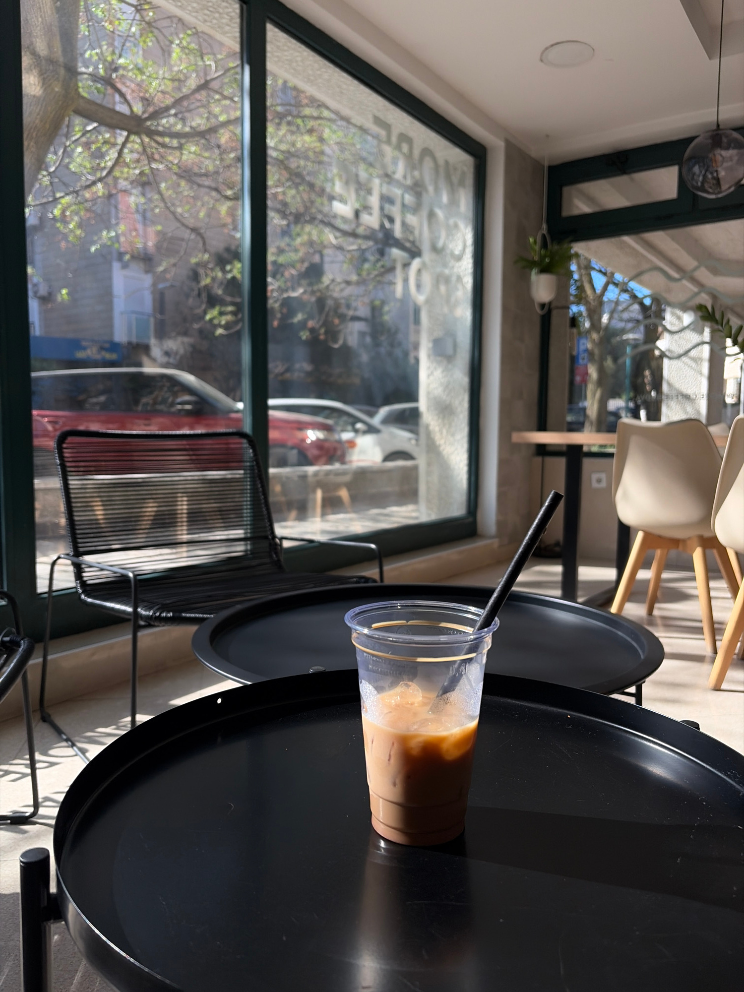 The image displays an indoor scene, likely a cafe or restaurant, on a bright, sunny day in Budva, Montenegro. The main subject in the foreground is a clear plastic cup containing iced coffee with ice…read more