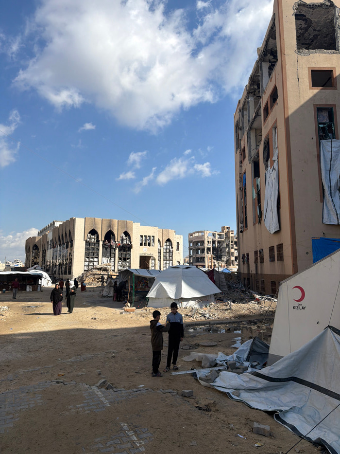 Destroyed buildings line a street with tents, some marked with the Turkish Red Crescent (Türk Kızılayı) logo. Debris litters the ground. Two people stand on the sandy, dirt-covered ground. The sky is…read more