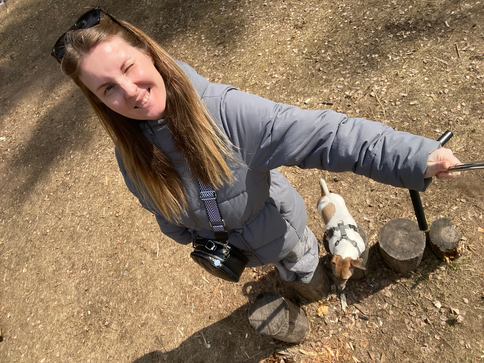 A woman wearing sunglasses on her head and a gray down coat smiles while taking a selfie with a selfie stick. She is standing in a park-like area on a ground covered with dry leaves and twigs. A small…read more