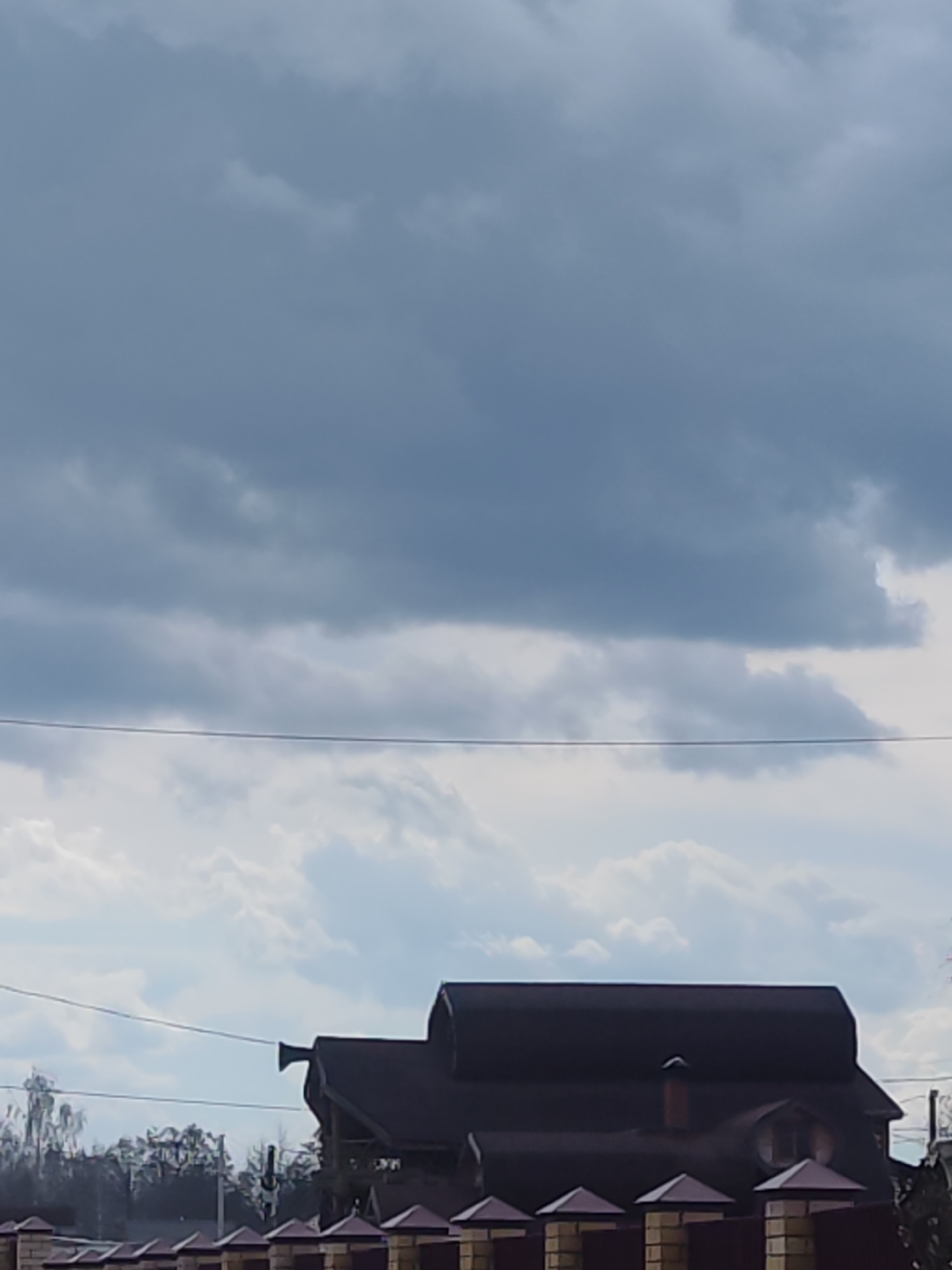 The image captures a static outdoor scene, focusing on a cloudy sky above a house and fence. The upper two-thirds of the frame are dominated by a dense, overcast sky, featuring dark grey clouds in the…read more
