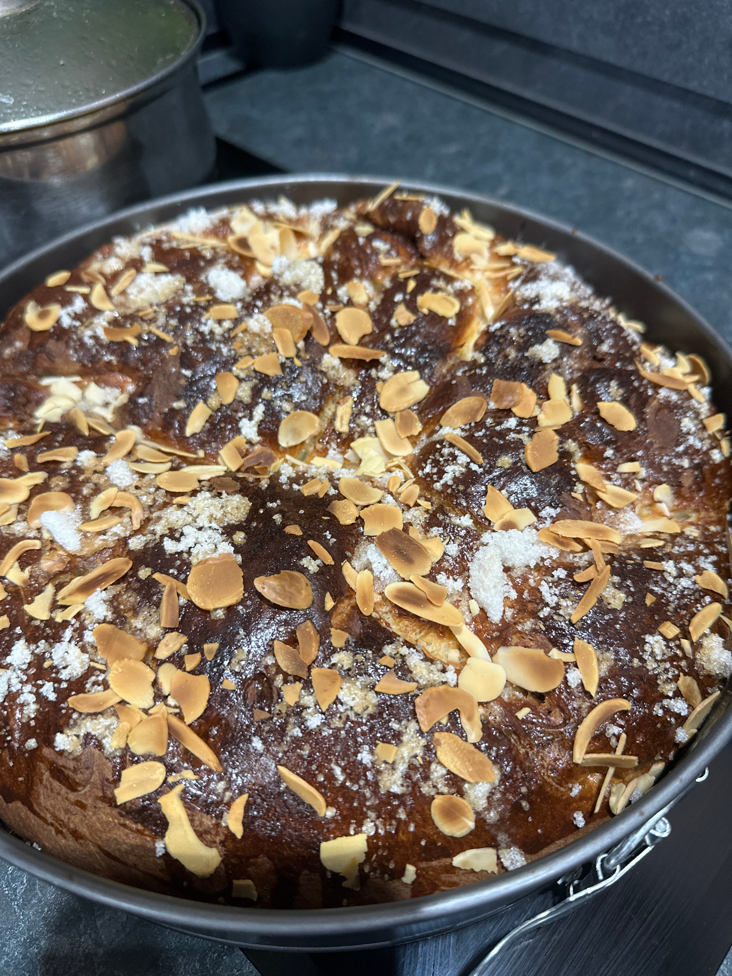 The image shows a baked cake in a springform pan, likely on a kitchen countertop. The cake has a glossy, dark brown top, sprinkled with granulated sugar and toasted almond slivers. A portion of a meta…read more