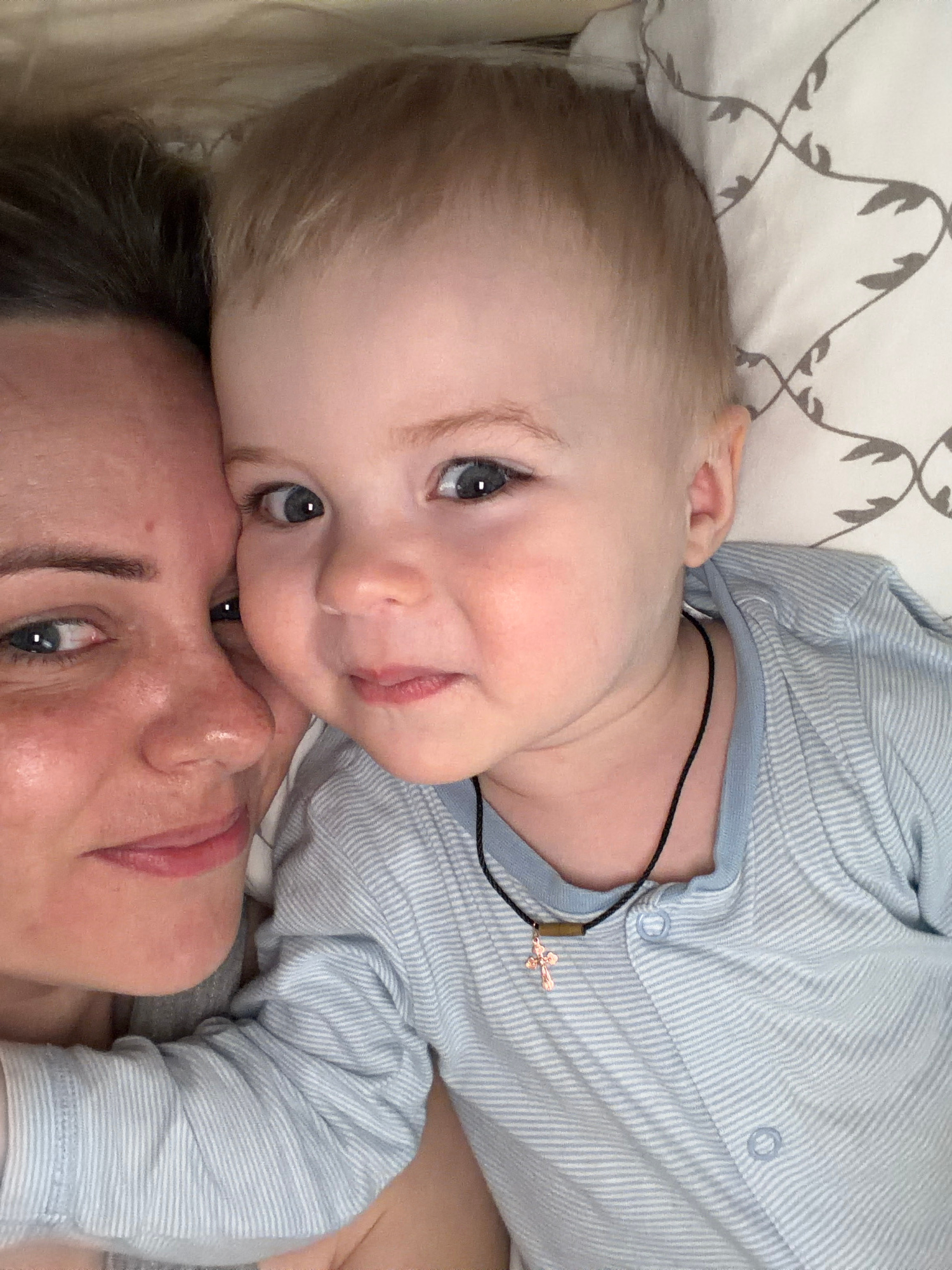 A close-up, overhead shot shows a baby and an adult lying on what appears to be a bed. The baby is fair-skinned with blue eyes and light blonde hair. The baby is wearing a light blue striped onesie an…read more