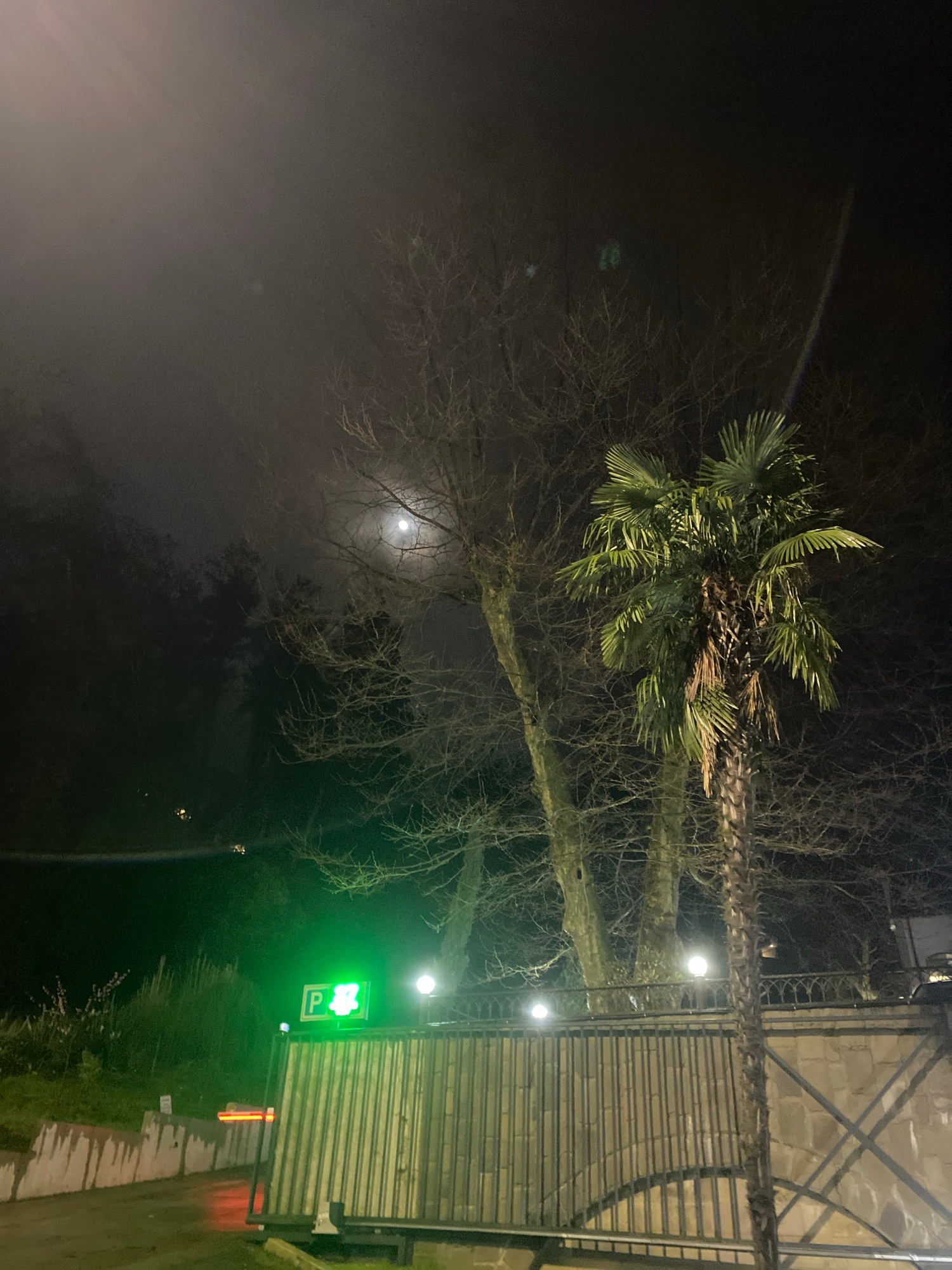 The image shows a nighttime scene in what appears to be a parking area with a green "P" sign illuminated, possibly indicating a parking space. A palm tree is visible, illuminated from below, along wit…read more