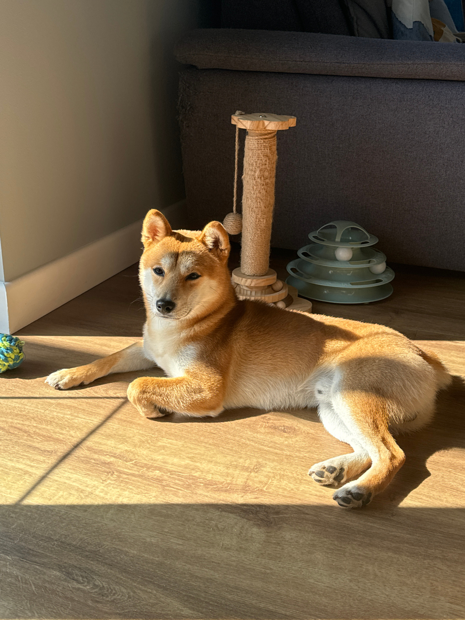 A Shiba Inu dog lies on a wooden floor, partially illuminated by sunlight. The dog is next to a scratching post and a cat toy with multiple tiers and balls. The setting appears to be indoors, likely i…read more