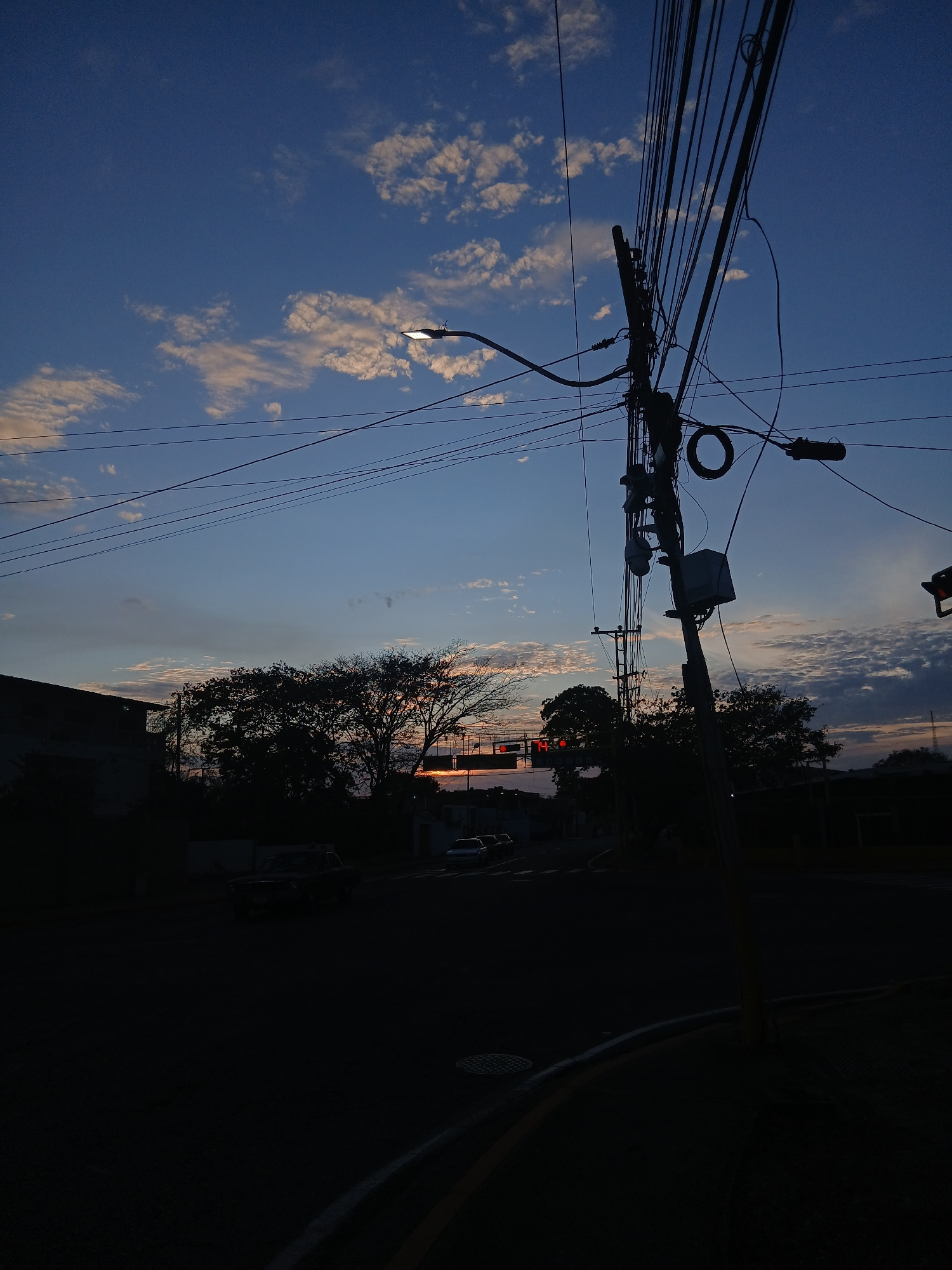 The image depicts a street scene at dusk in Juan Griego, Venezuela. A utility pole laden with wires dominates the left side of the frame, extending into a blue sky with scattered clouds. A street lighβ¦read more