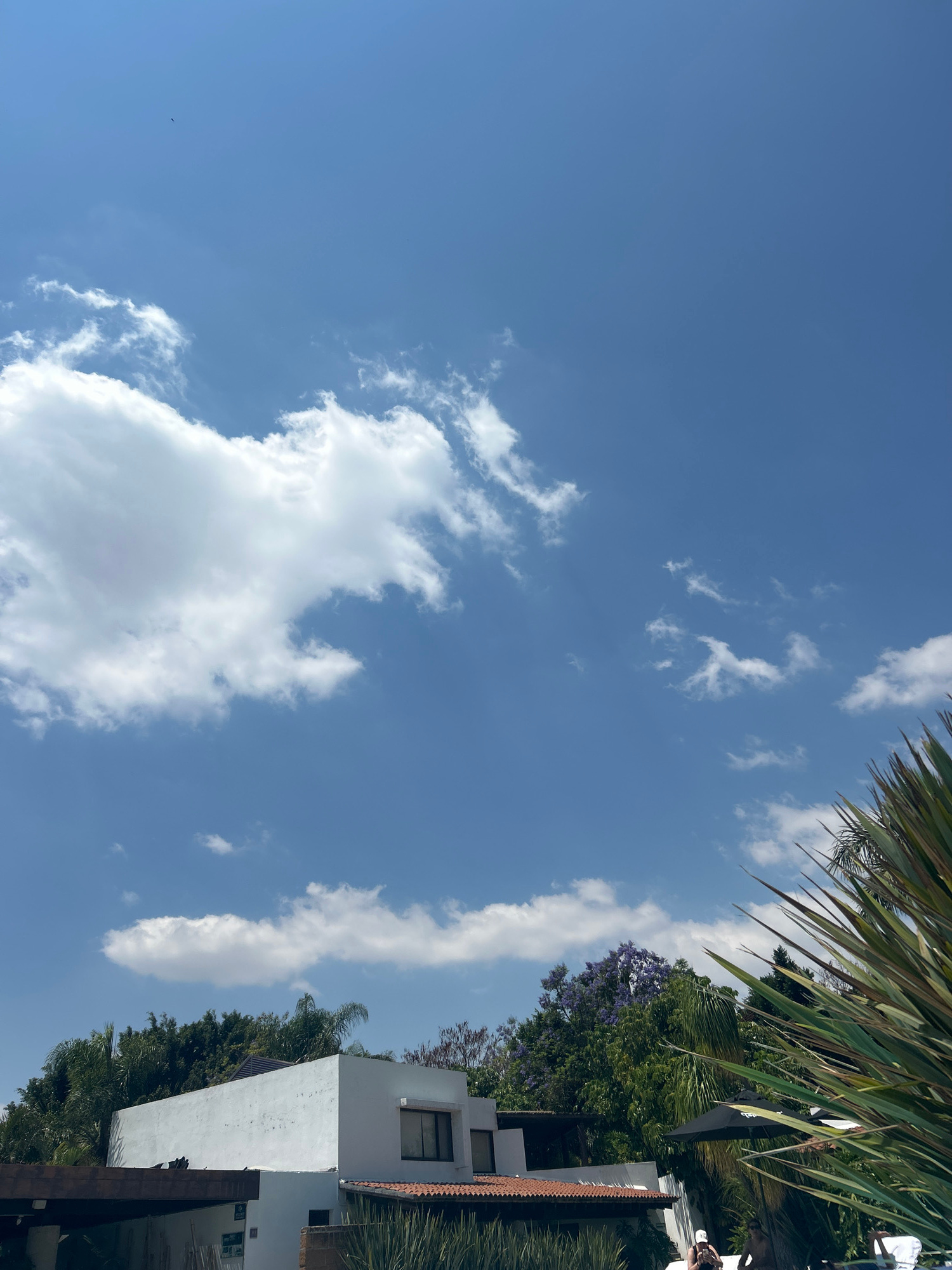 The photograph, taken in Atlixco, Mexico, depicts a bright blue sky with scattered cumulus clouds. The right side of the frame features the top of a white building with a red tile roof partially obscu…read more
