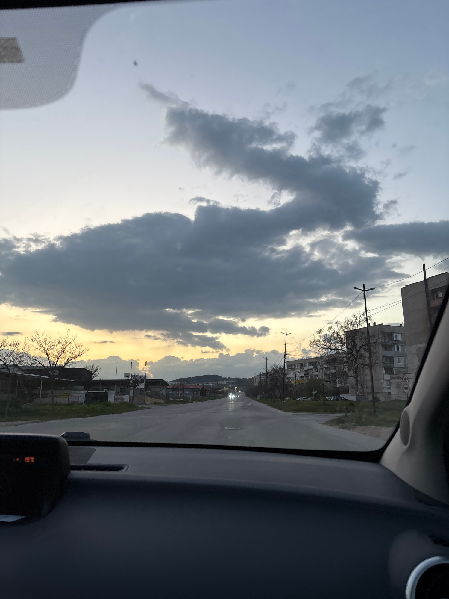 The image shows a view from inside a car driving on a wet road in Panagyurishte, Bulgaria. The sky is filled with heavy, dark clouds, although there is also a band of lighter, sunset-like colors visib…read more