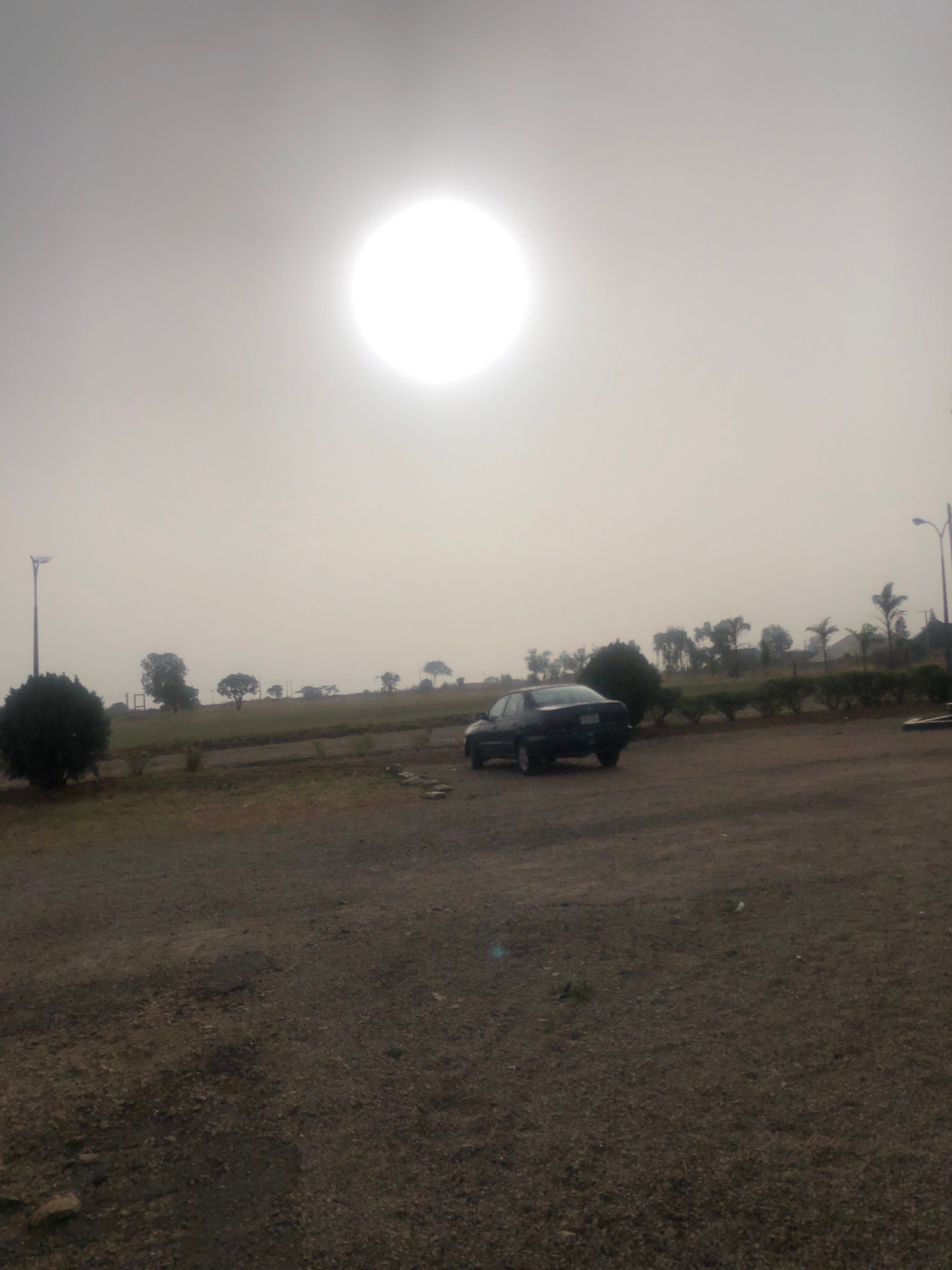 The image shows a hazy outdoor scene, likely taken at dawn or dusk due to the prominent, bright sun obscured by a layer of mist. The location appears to be an open area, possibly a park or undeveloped…read more