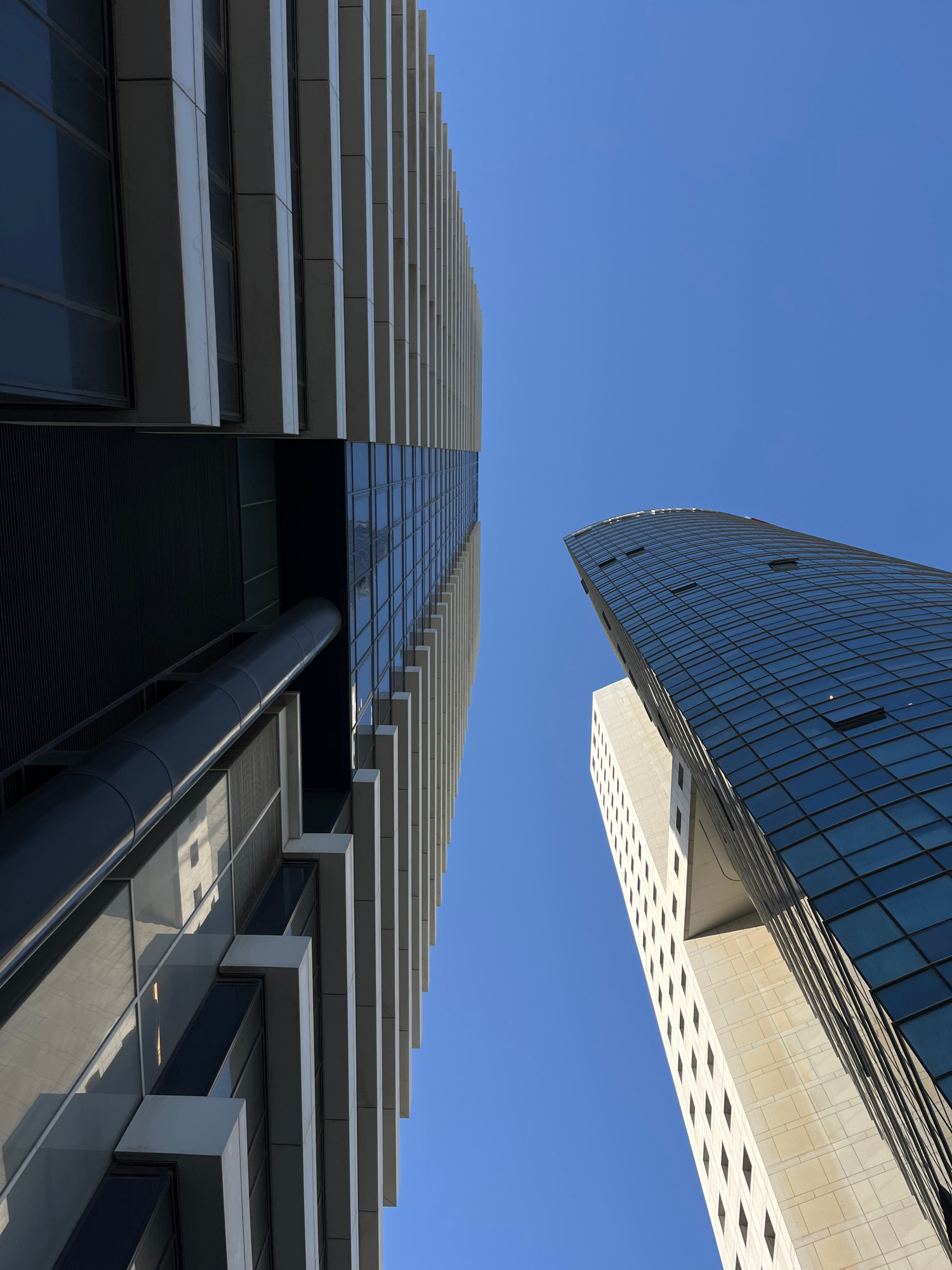 The image shows two modern buildings in Tel-Aviv, Israel, viewed from a low angle looking up at a clear blue sky. The bottom building is tall and narrow, with horizontal white rectangular protrusions…read more
