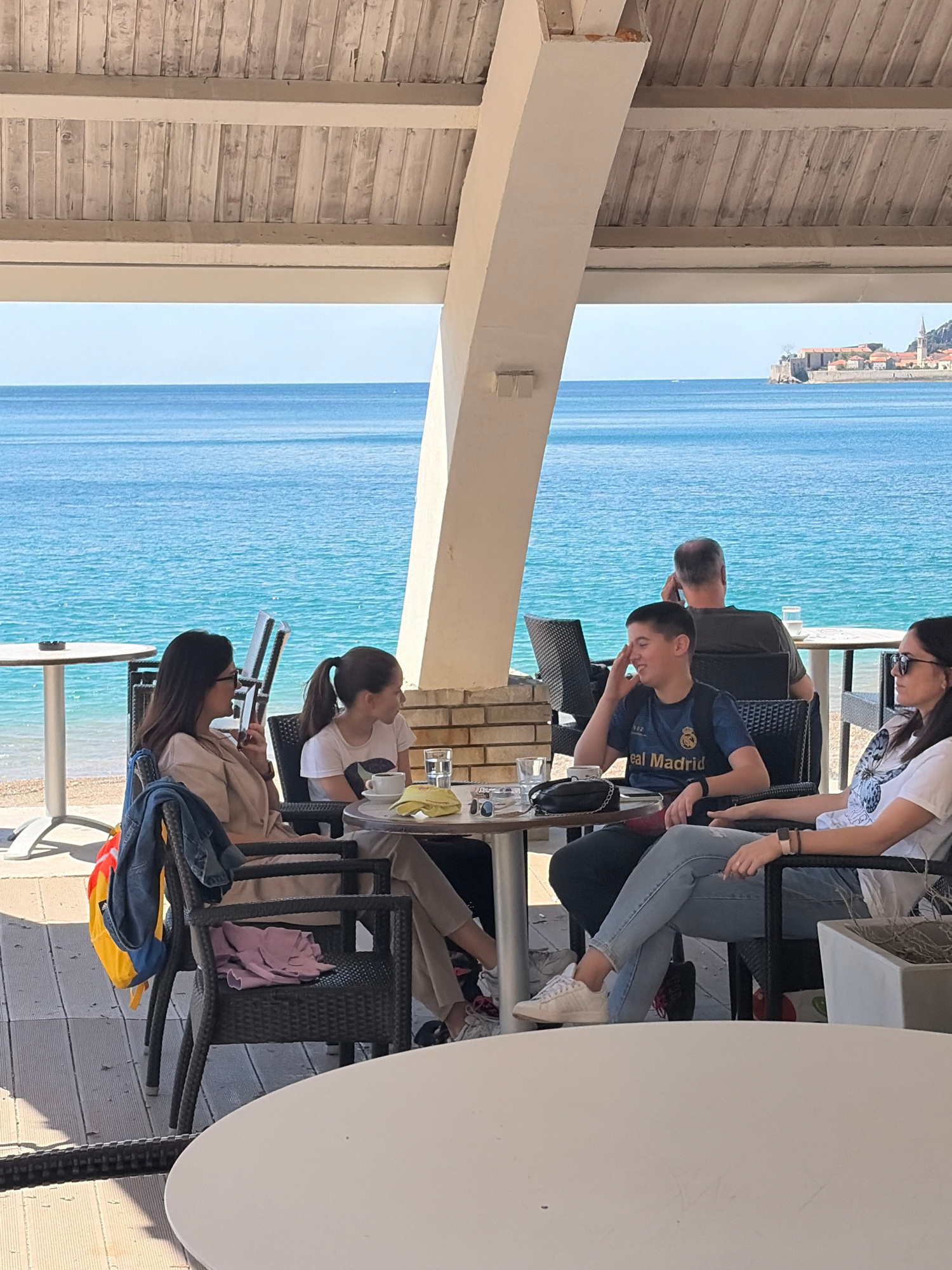 A group of people is seated at tables on the terrace of a restaurant overlooking the Adriatic Sea in Budva, Montenegro. To the left, a partly-visible roof covers the terrace. The turquoise sea stretch…read more