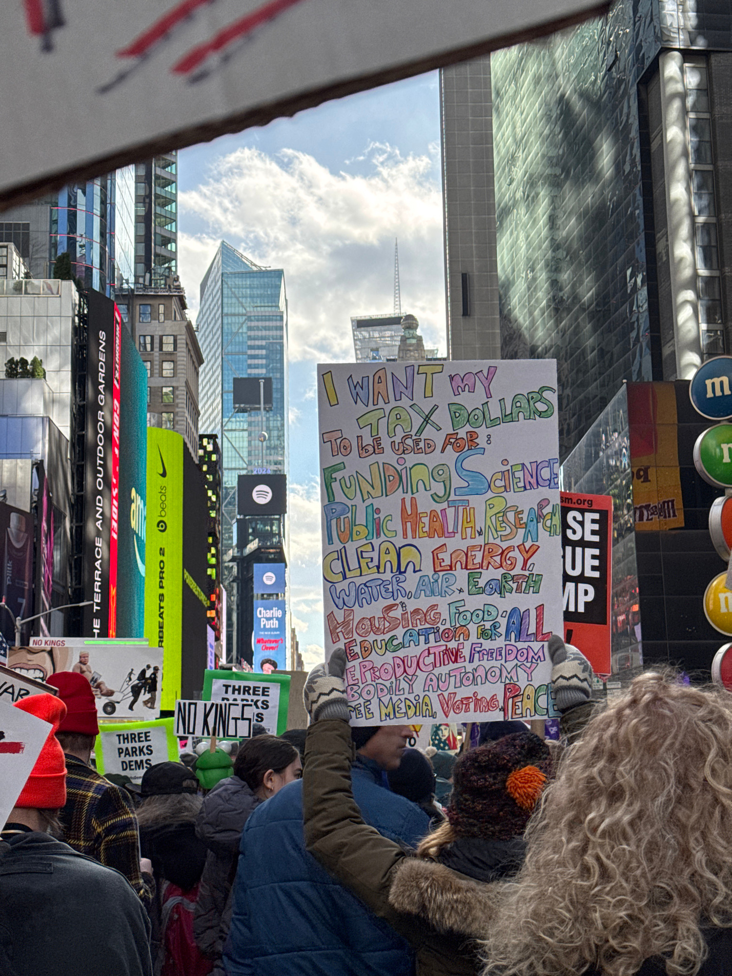 The image depicts a protest in Times Square, New York City. Demonstrators are gathered, holding signs with messages advocating for tax dollar allocation towards science, public health, clean energy, w…read more