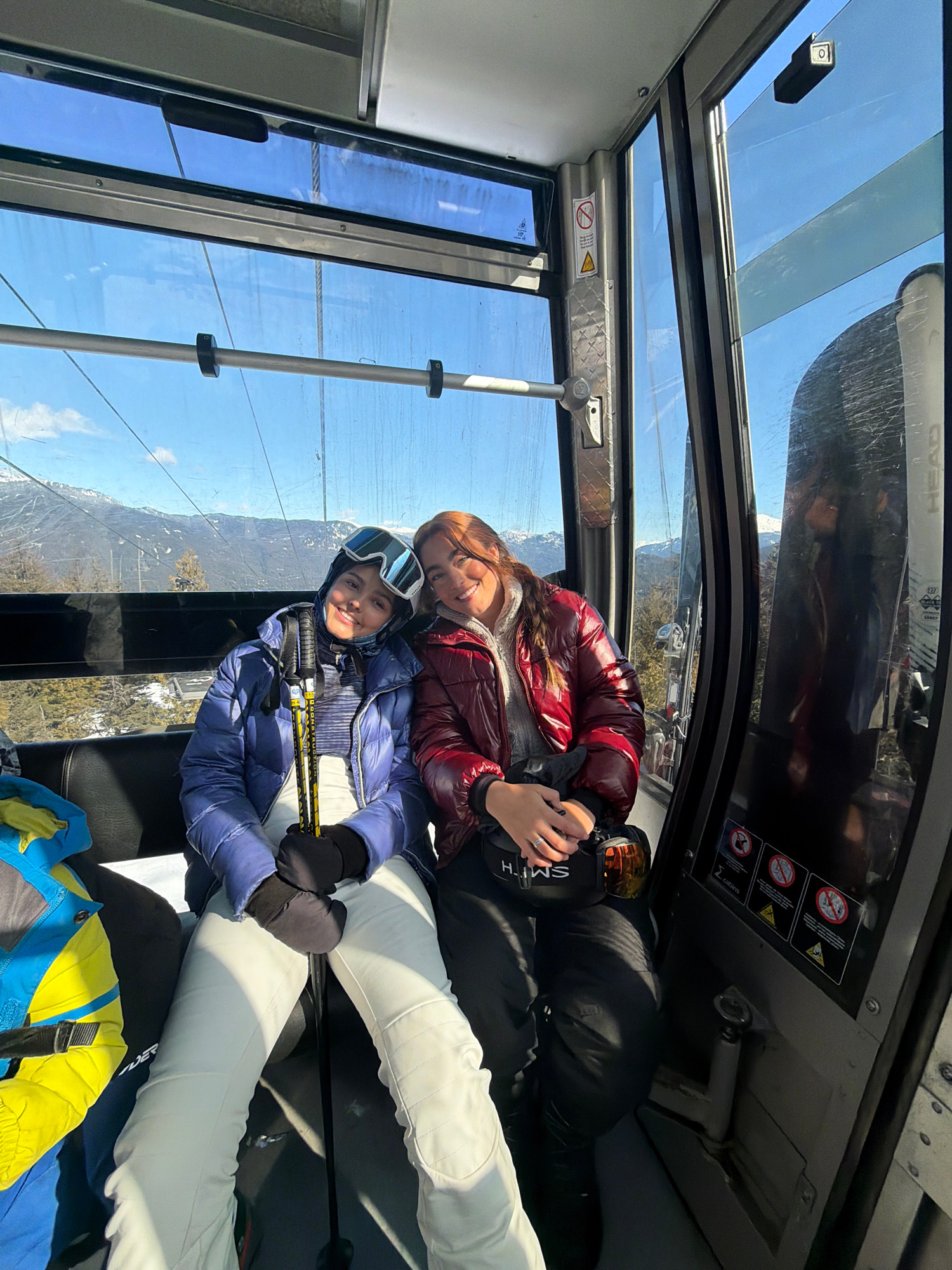 Two females are inside a Whistler gondola in Canada. One female wears a blue jacket, ski goggles, black gloves, and white pants, holding ski poles. The other female wears a red jacket, black pants, an…read more