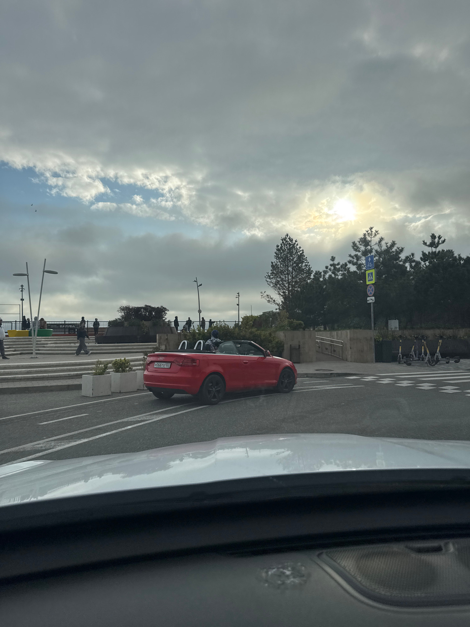 The image shows a red convertible parked in a parking lot in Sirius, Russia. People are seen walking along a raised boardwalk parallel to the parking spaces. The sky is cloudy with the sun visible thrβ¦read more