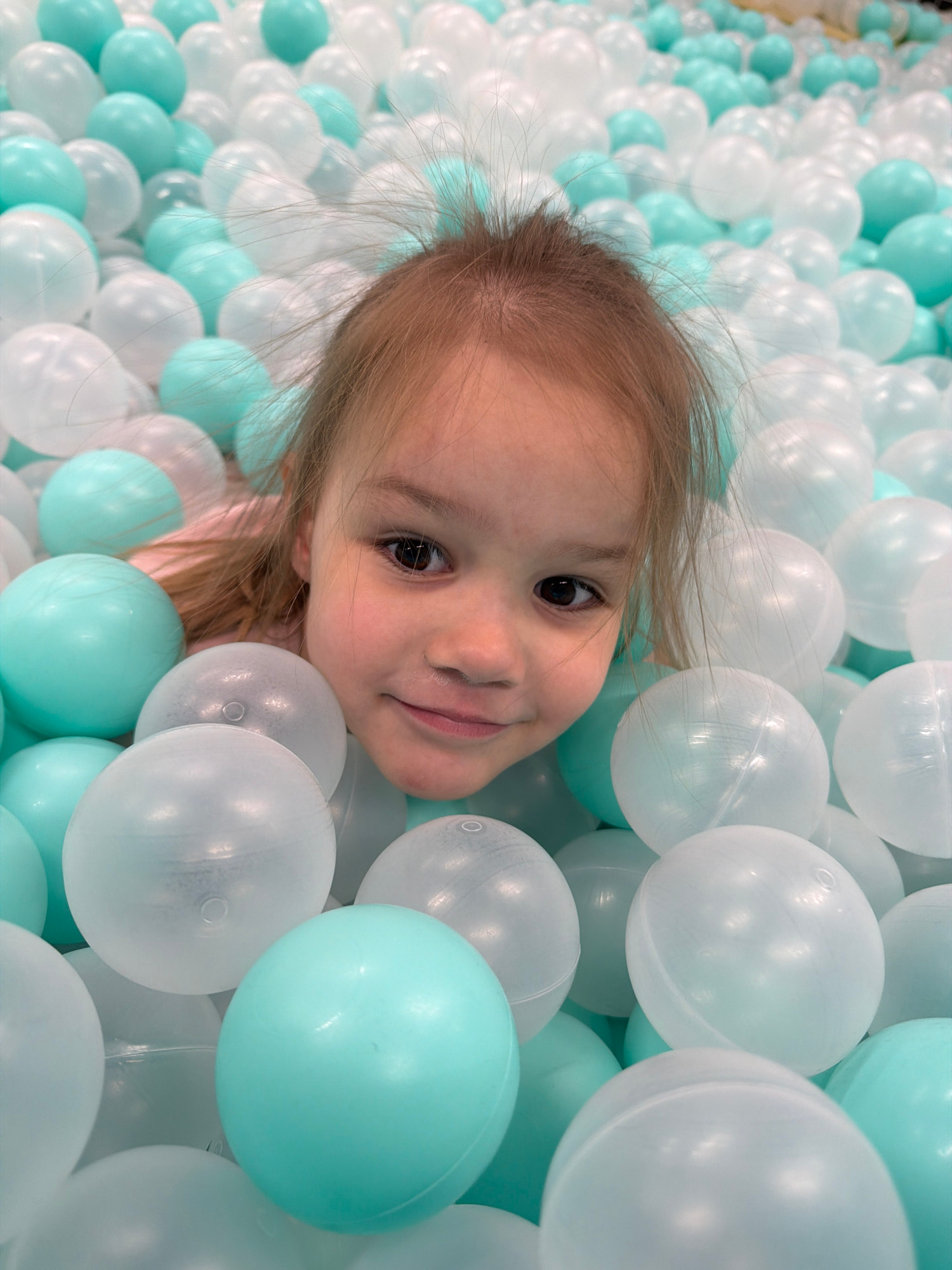 A young girl is surrounded by a ball pit of white and light blue balls. The girl has light brown hair and is smiling. Her head is tilted to the side. The balls are translucent. The photo appears to be…read more