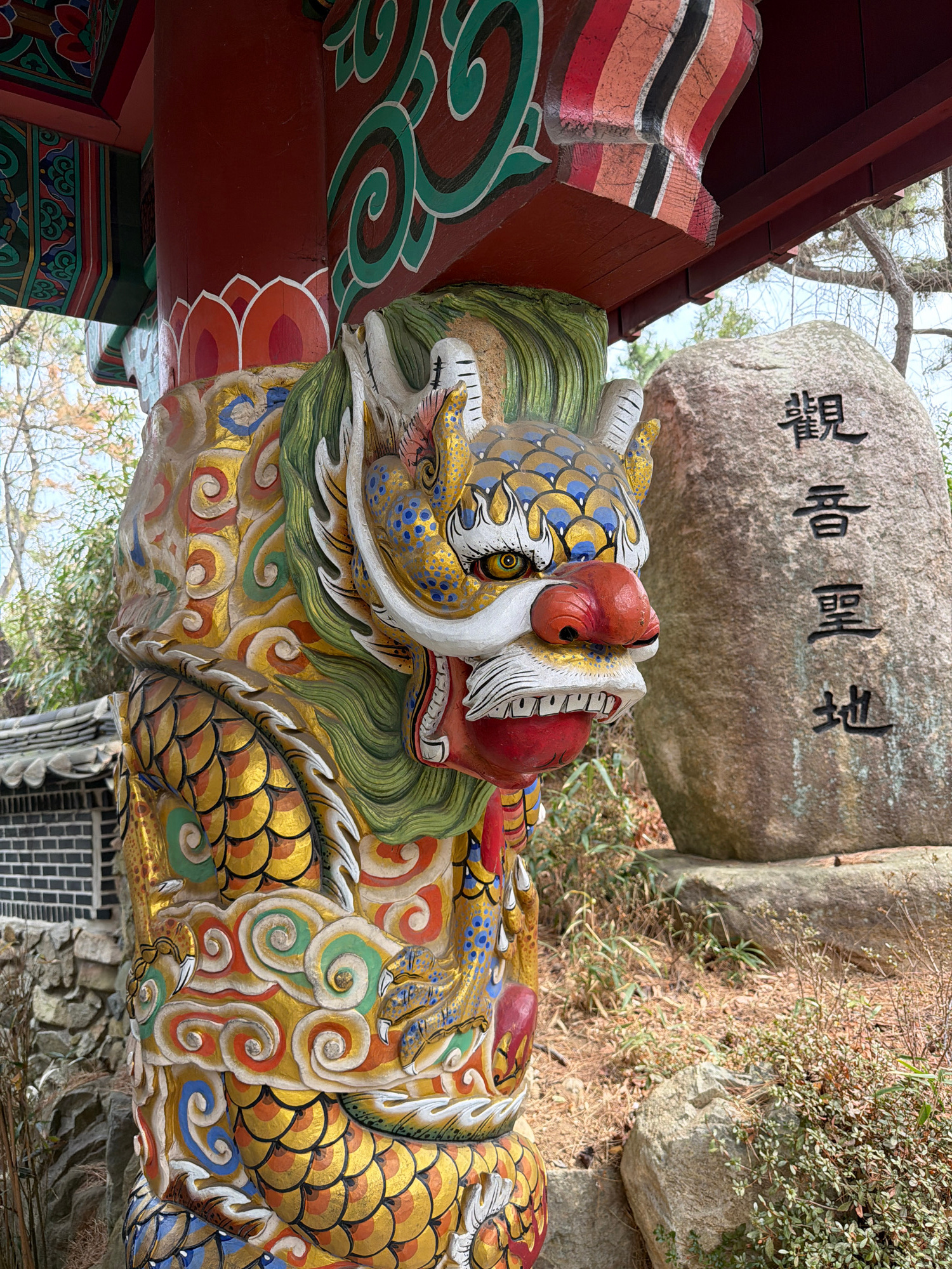 A color photograph depicts a close-up view of a vividly painted dragon sculpture, part of a traditional Korean architectural structure, likely a temple or gate. The dragon is adorned with a complex pa…read more