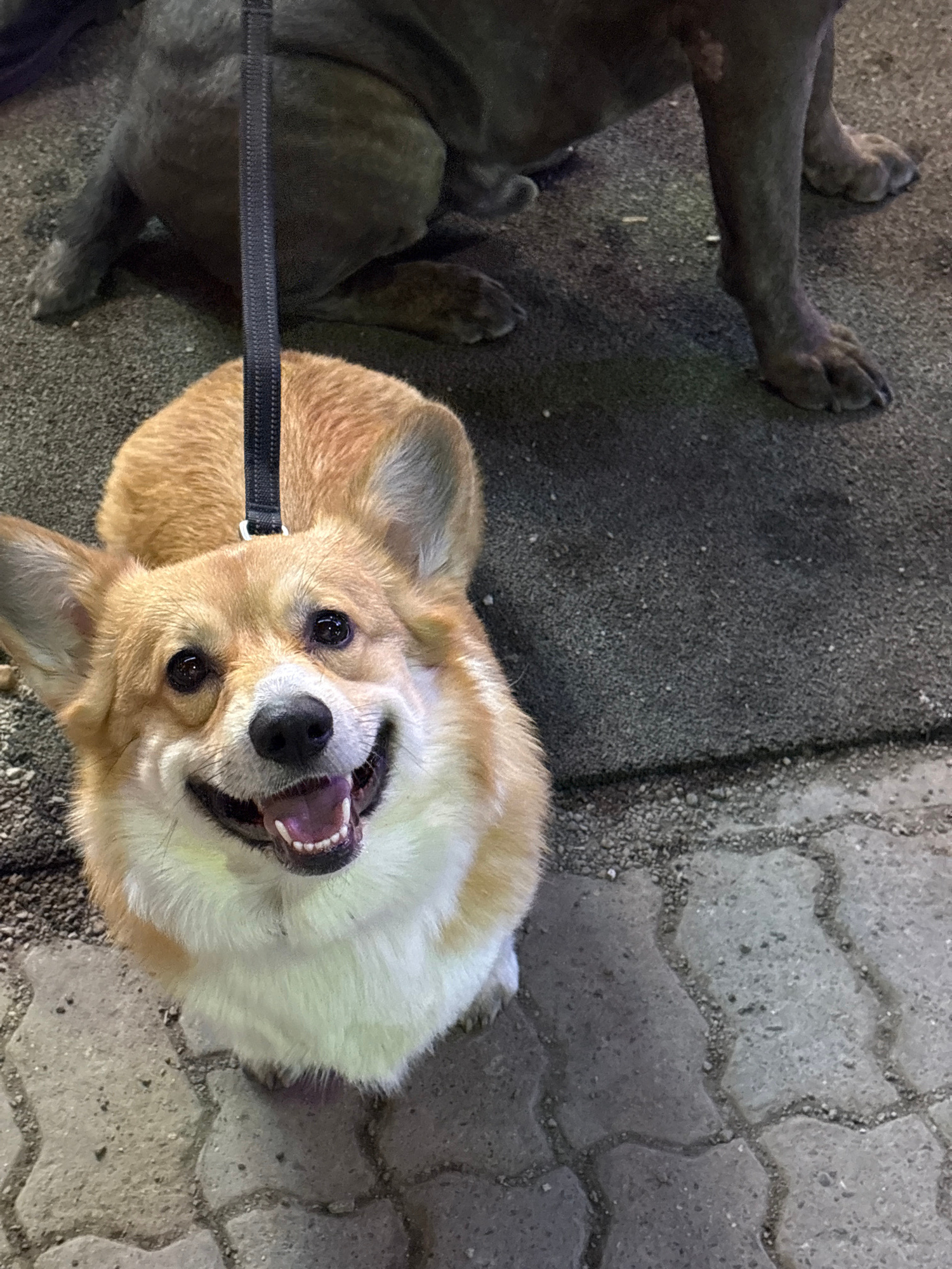 A high-angle shot depicts a light-brown and white corgi dog looking up at the camera. The dog has its mouth open, exposing its teeth and tongue. A black leash is attached to the dog's collar. To the lā¦read more