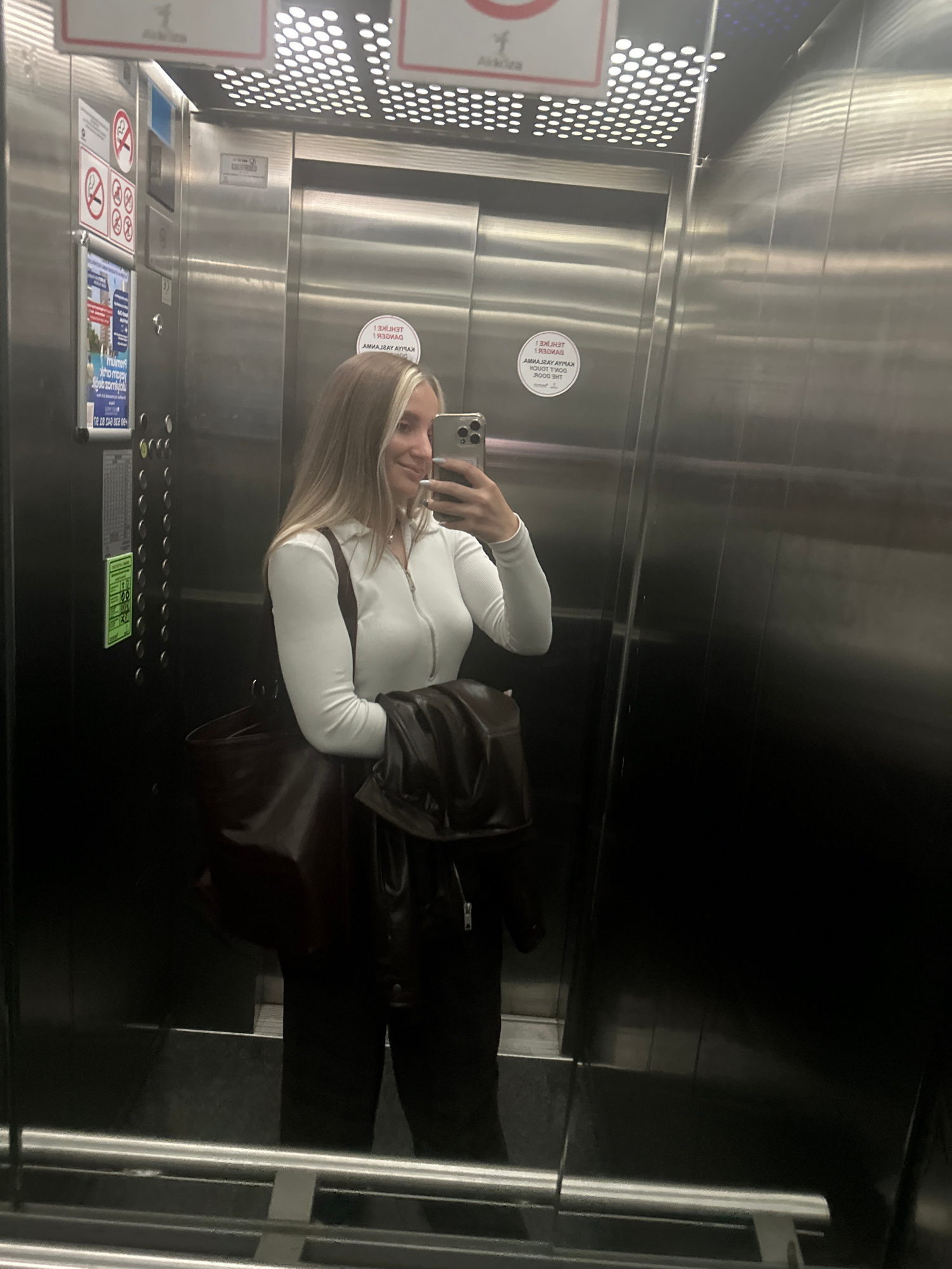 A young woman is taking a selfie in an elevator. She has long blonde hair and is wearing a white long-sleeved shirt and black pants. She is holding a smartphone in her right hand, and a leather jacketβ¦read more