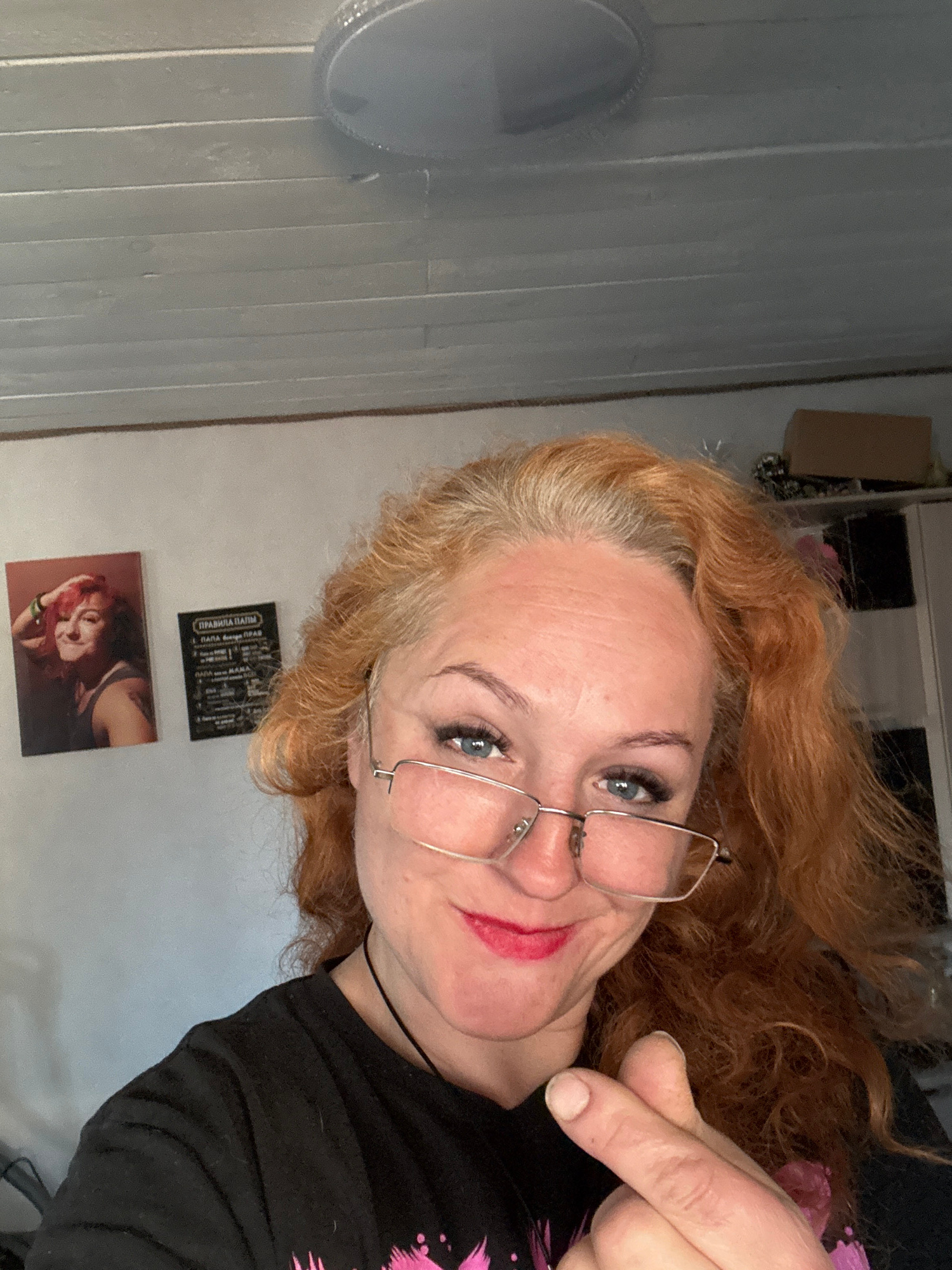 A selfie depicts a woman with fair skin, blue eyes, and red, curly hair, wearing glasses and dark clothing. She is pointing with her right hand towards the viewer. The background includes a white pane…read more