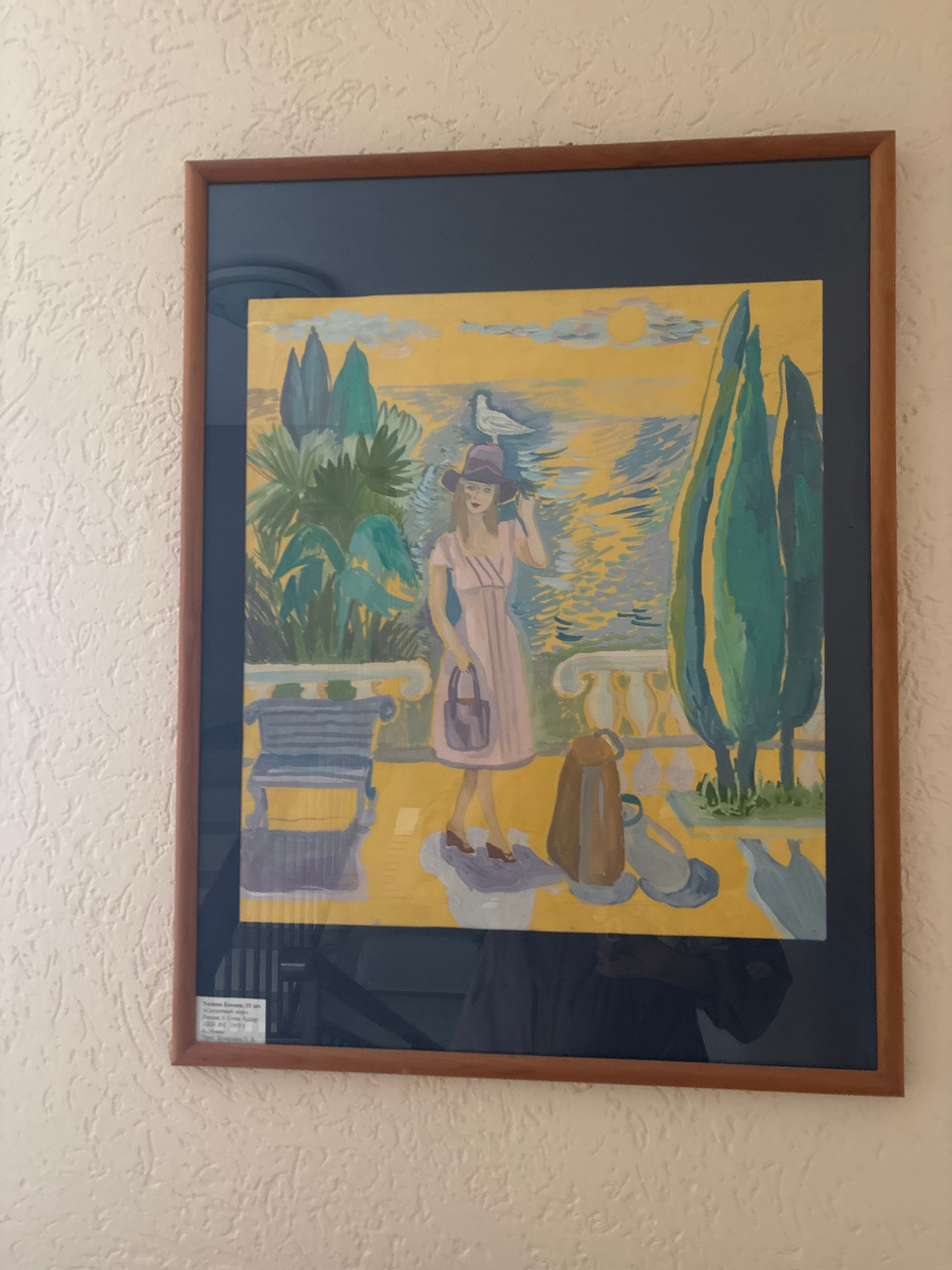 A framed painting hangs on a textured, off-white wall. The painting depicts a scene in a style reminiscent of Impressionism or Post-Impressionism. The main subject is a woman in a dress and hat, lying…read more