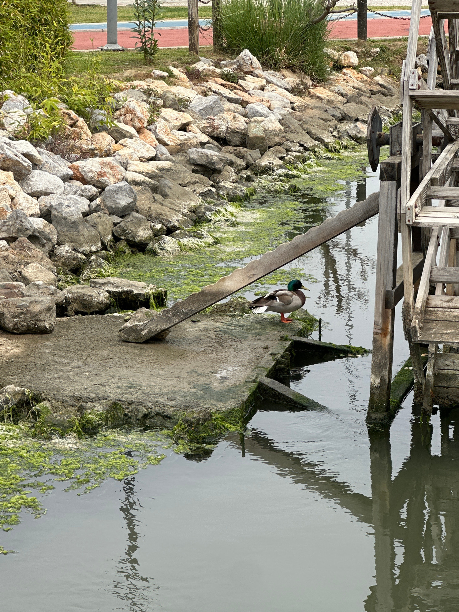 A mallard duck stands on a concrete platform with its right leg raised, situated between a rocky bank and water. The platform is partially covered in green algae. A wooden beam leans against the platf…read more